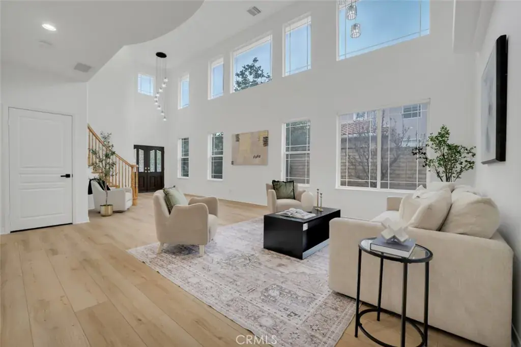 Set within the prestigious, gated Villagio Estates in Porter Ranch, this beautifully maintained two-story 4 bed, 4 bath + den residence offers an exceptional blend of refined living, thoughtful updates, and the security and exclusivity of a controlled-access community. Spanning approximately 3,300 square feet, the home reflects a high level of care and pride of ownership, with attractive architecture, stacked stone accents, and a welcoming formal entry that immediately conveys quality and sophistication. Step into soaring two-story ceilings, abundant natural light from clerestory windows, and striking new lighting fixtures that highlights the openness of the formal living/dining space. Fresh paint, new flooring throughout the house, newly remodeled kitchen, new bathroom fittings, lighting fixtures, door hardware, kitchen appliances and so much more! The home’s thoughtful upgrades and high-end finishes reflect meticulous care and pride of ownership throughout. French doors open to a private office or den with a plantation shuttered passthrough to the adjacent family room, which could be converted to act as an additional bedroom if desired. The inviting informal living space has a cozy, raised-hearth fireplace and seamlessly flows into the stunning kitchen. Beautifully appointed with two tone shaker cabinets, white quartz countertops, marble backsplash, brand-new stainless-steel appliances, and convenient central island. The adjoining, sunny breakfast nook has both breakfast bar seating and room for informal dining surrounded by windows. Upstairs, the generous bedroom layout includes well-sized bedrooms, a full Jack-and-Jill bath, a secondary en-suite bedroom with walk-in closet and ¾ bath, and a spacious primary suite featuring vaulted ceilings, French doors to a private balcony with hillside views, dual walk-in closets, and a luxurious en-suite bath with jacuzzi tub, oversized glass shower, dual sinks, and vanity area. The outdoor space offers a wide patio, built-in BBQ, and a decorative pond with smartphone operated waterfall feature, creating a serene setting for entertaining or quiet evenings. Set within a controlled-access community close to shopping, dining, parks, and top-rated schools, this move-in-ready home delivers generous scale, refined finishes, and the confidence of a residence that has been carefully maintained and tastefully designed for comfort, quality, and long-term enjoyment. Don’t miss this one!