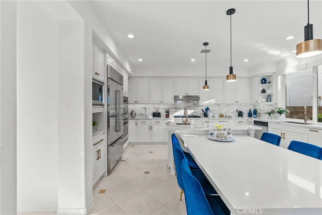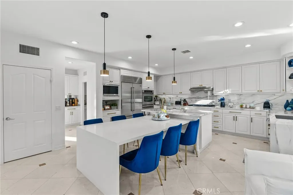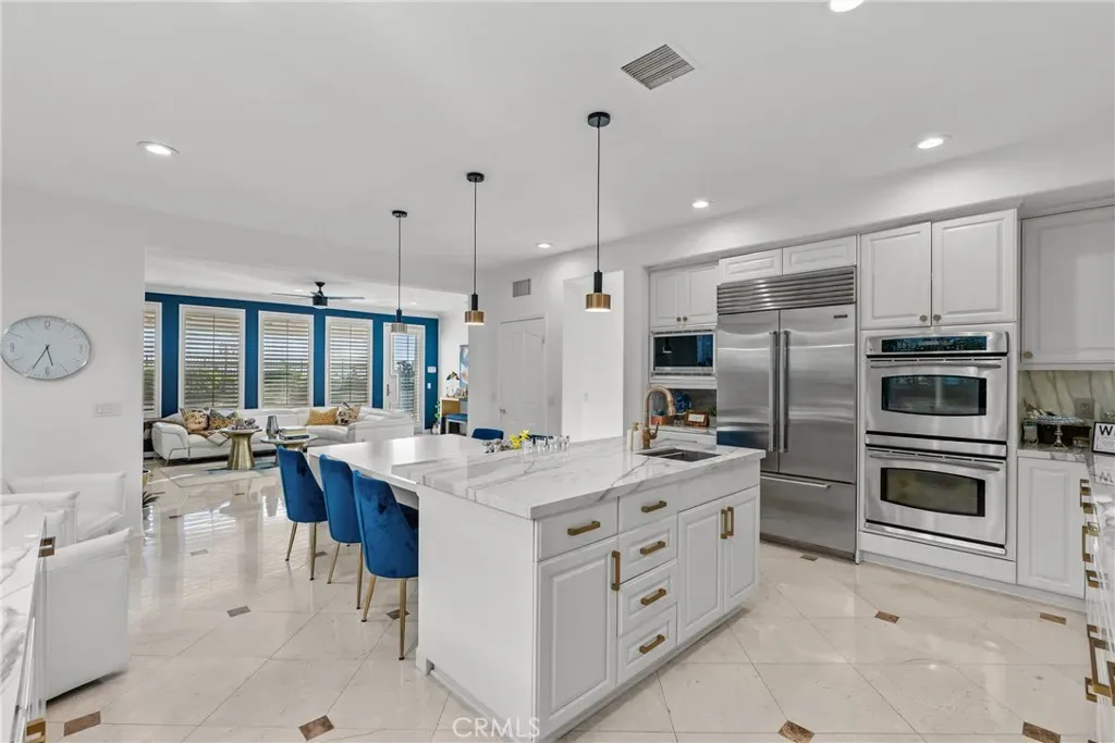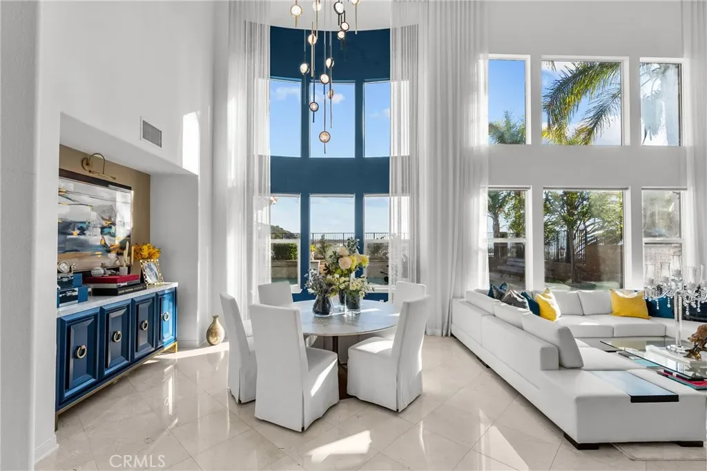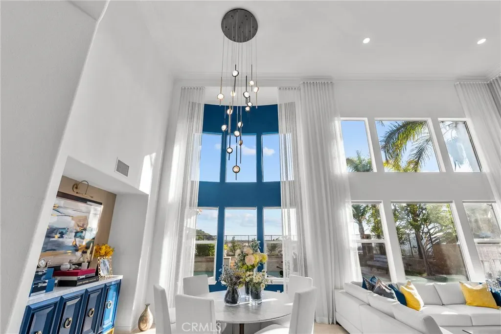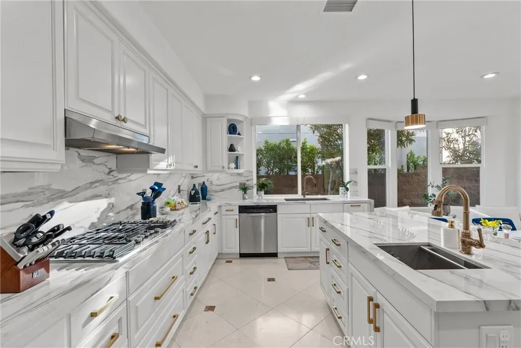 Upon entry, soaring ceilings and abundant natural light showcase the home’s open and airy layout. The interior features a sophisticated transitional design with extensive recent upgrades, contemporary lighting, and carefully curated details that create a modern yet timeless feel. The gourmet kitchen opens seamlessly to the spacious family room and living areas, offering the perfect setting for both everyday living and effortless entertaining.