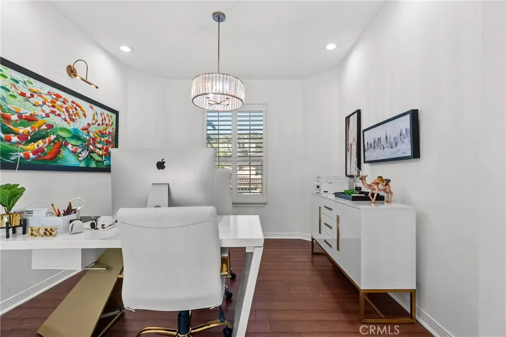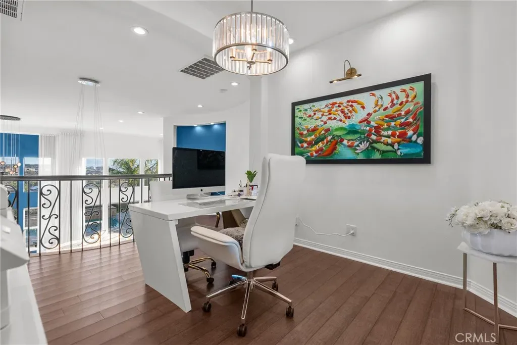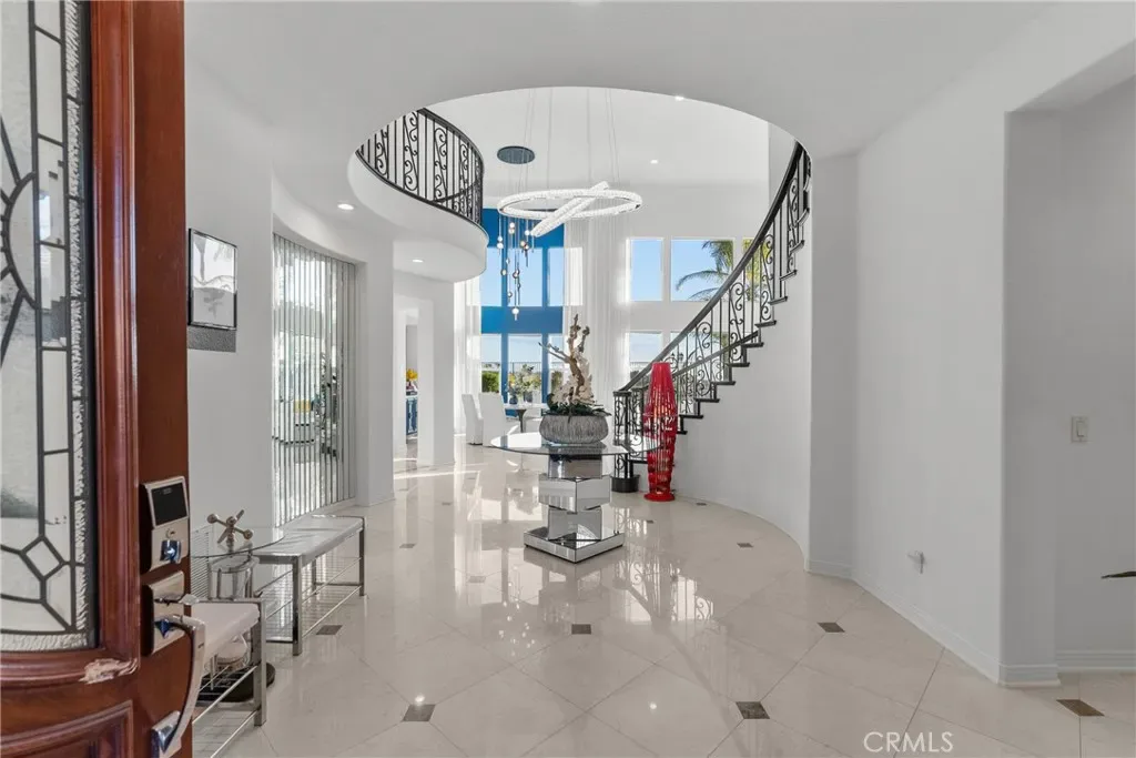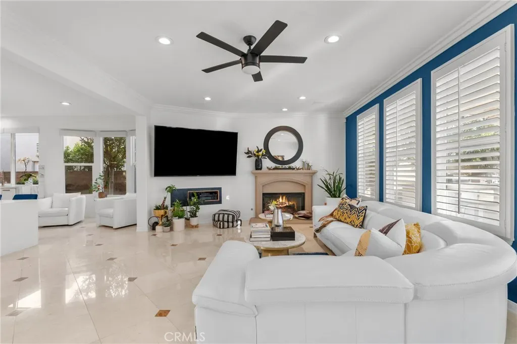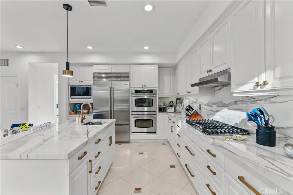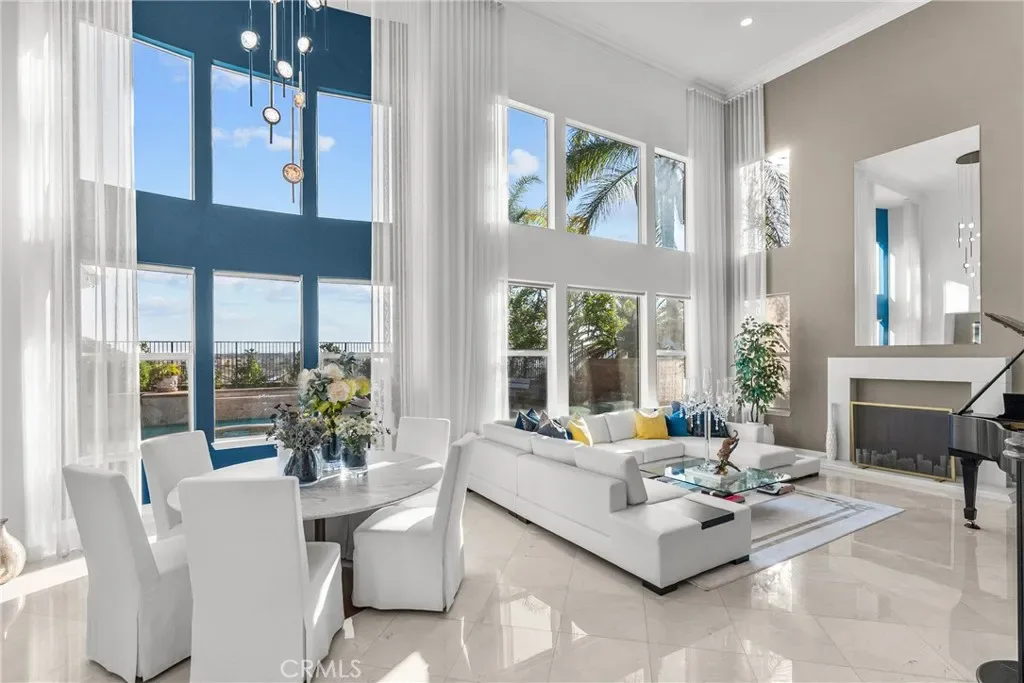 Upon entry, soaring ceilings and abundant natural light showcase the home’s open and airy layout. The interior features a sophisticated transitional design with extensive recent upgrades, contemporary lighting, and carefully curated details that create a modern yet timeless feel. The gourmet kitchen opens seamlessly to the spacious family room and living areas, offering the perfect setting for both everyday living and effortless entertaining.