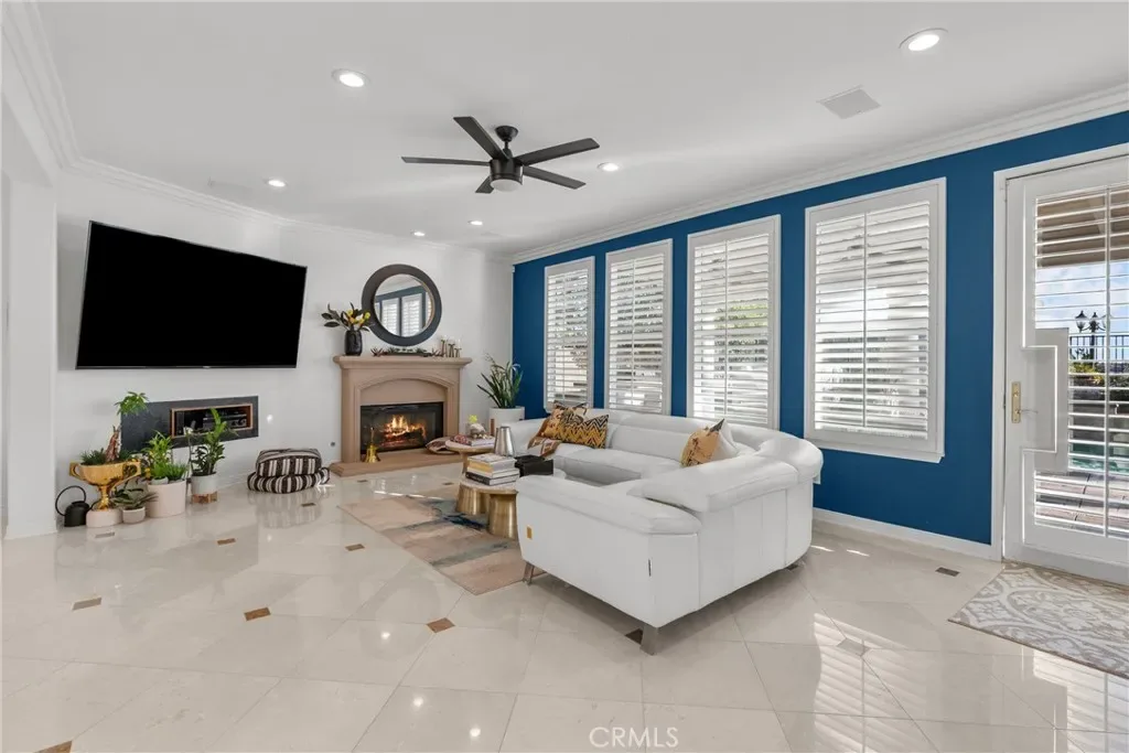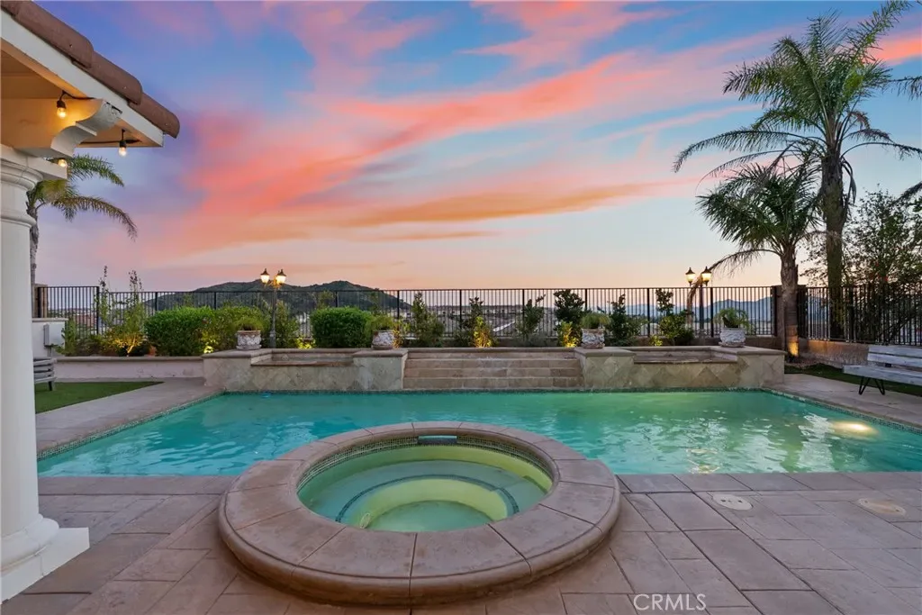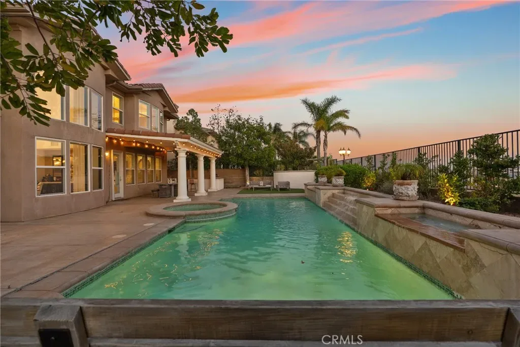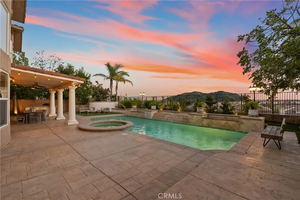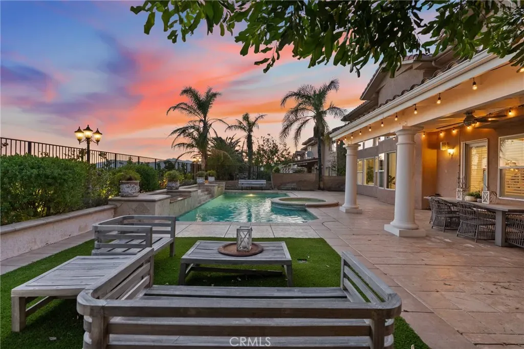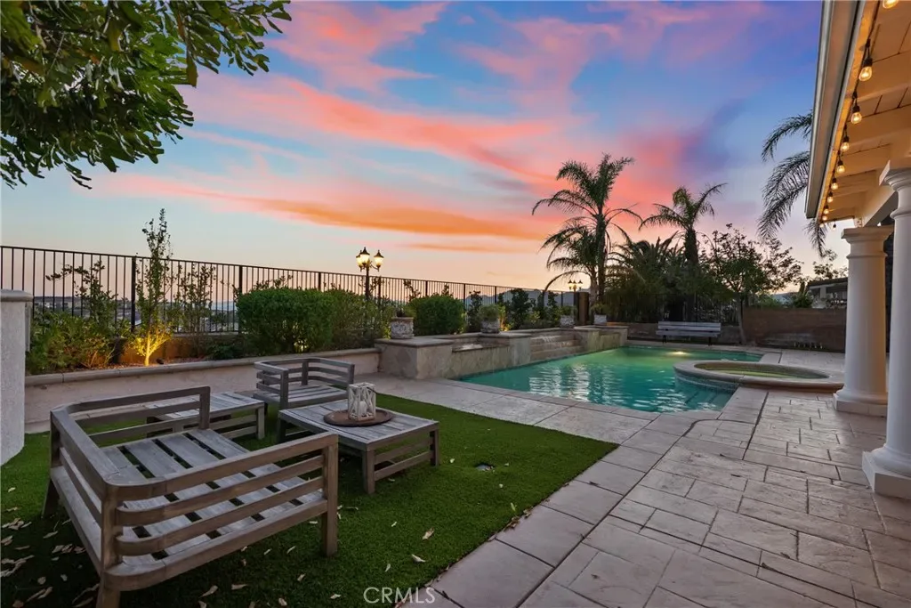 Step outside to a beautifully designed backyard oasis featuring a sparkling pool and spa, outdoor fireplace, and multiple areas for entertaining or relaxing. The outdoor space perfectly complements Southern California living with privacy and resort-style ambiance.