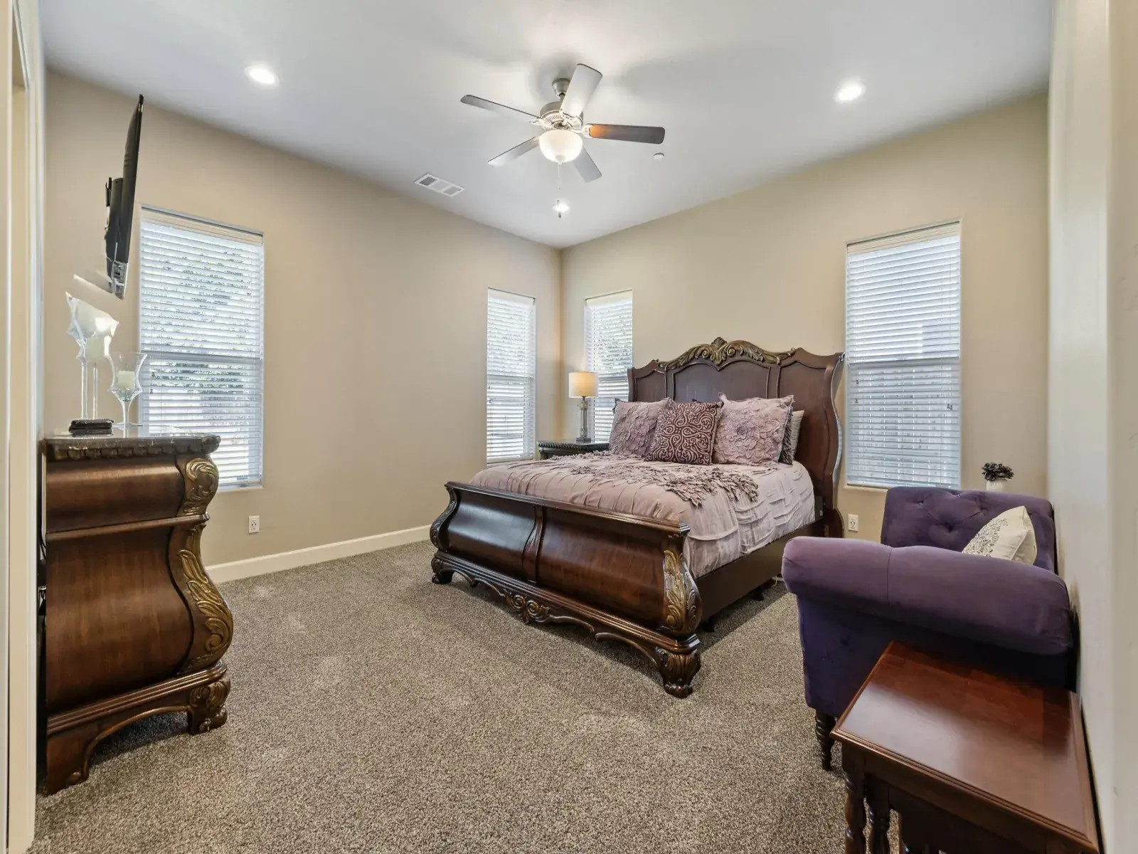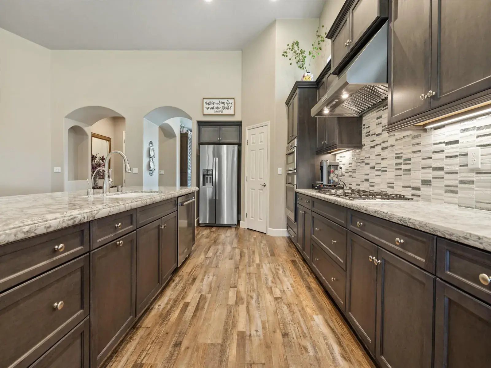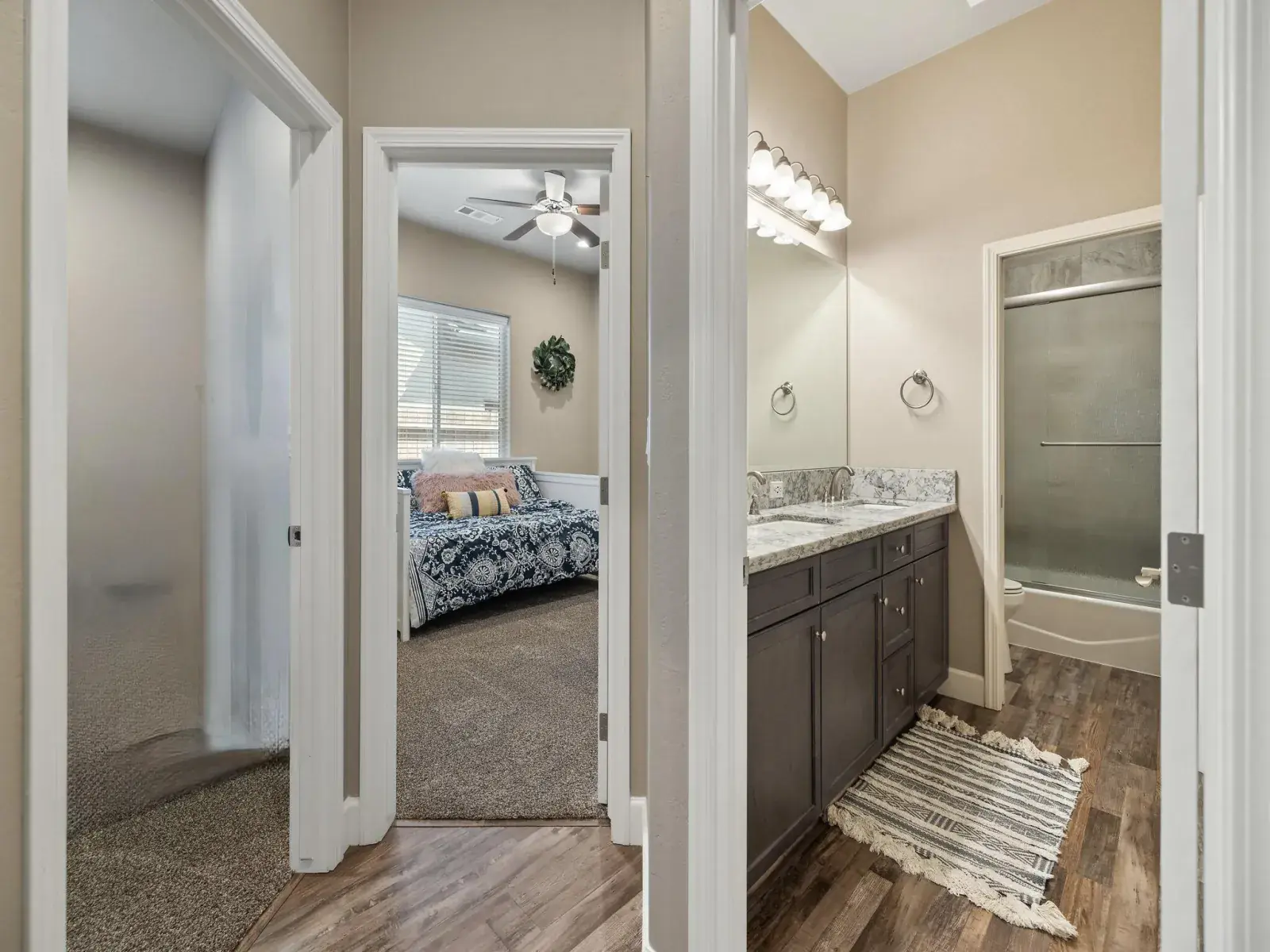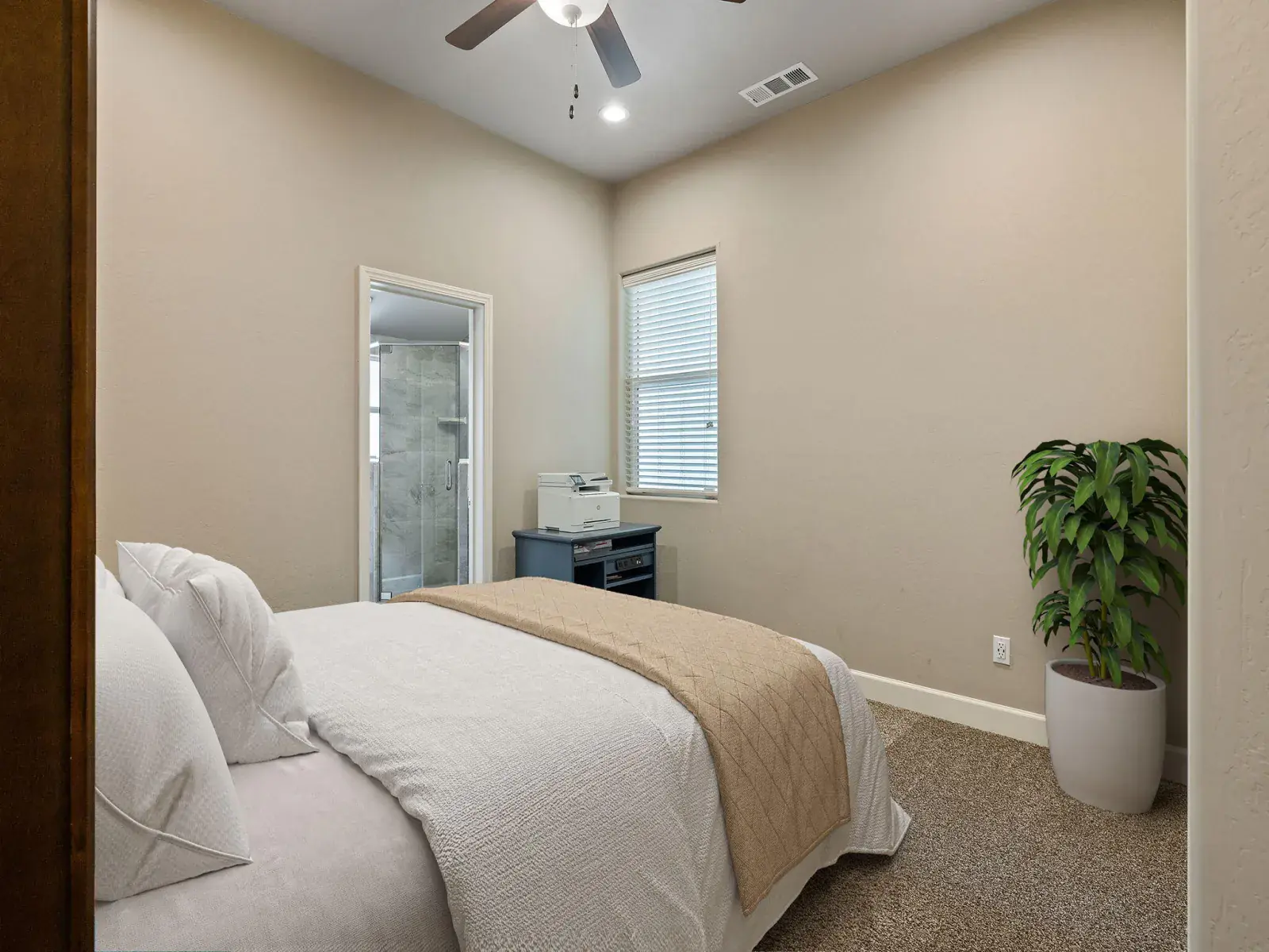 Enjoy luxury vinyl plank flooring throughout the main living areas, complemented by quality carpeting in the bedrooms. The home features endless cabinet storage and upgraded finishes throughout. A guest bedroom offers an en suite bathroom with a large tiled shower for added comfort and privacy. The primary bedroom is exceptionally spacious, accompanied by a huge primary bathroom with a massive tiled double shower, double sinks, and a large walk-in closet.