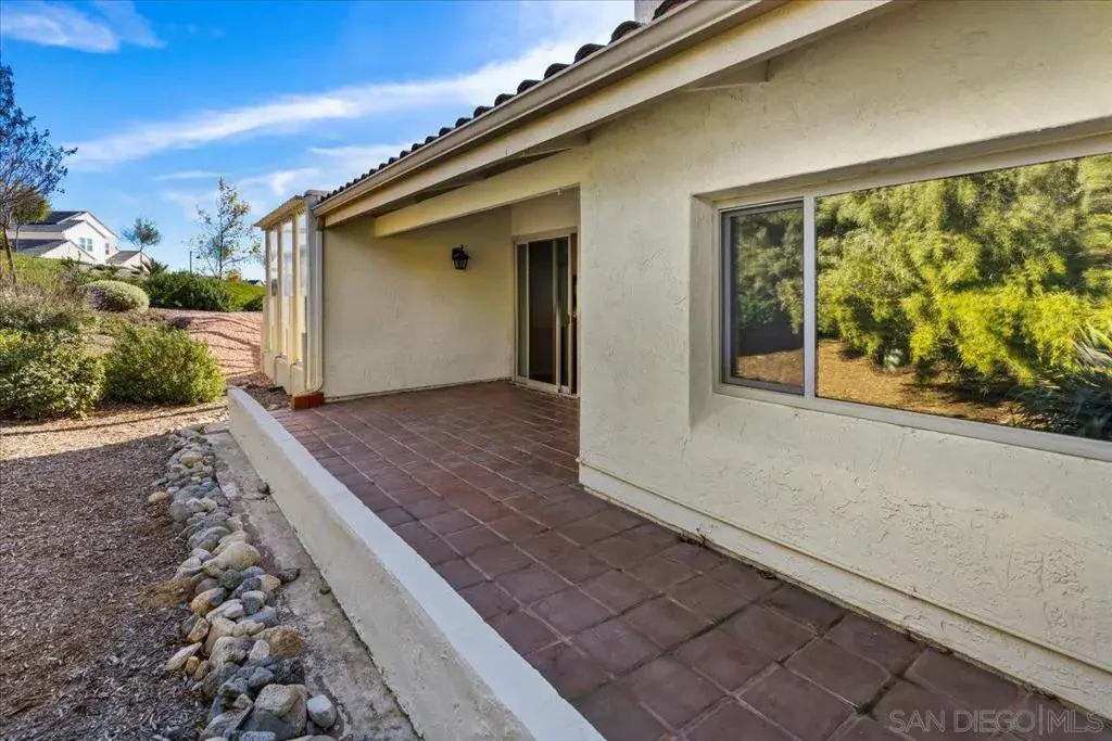 Nestled within the tranquil Stoneridge community of Poway, this beautifully updated single-story townhome offers an exceptional blend of architectural character and modern comfort. Soaring wood-planked, beamed ceilings create an immediate sense of warmth and volume, while the thoughtfully renovated kitchen showcases quartz countertops, designer cabinetry, stainless steel appliances, and generous storage. The expansive living and dining areas are filled with natural light and enhanced by luxury vinyl plank flooring, all centered around a timeless brick fireplace. Oversized dual-pane sliding doors extend the living space outdoors to a private tiled patio overlooking a serene desertscape hillside—perfect for relaxing or entertaining in peaceful surroundings. Inside, two generously sized bedrooms provide ideal separation and comfort, each featuring walk-in closets. The primary suite impresses with cathedral beamed ceilings, dual-sink vanity, extensive cabinetry, and a custom-organized walk-in closet. Additional highlights include recessed lighting, skylight, central air conditioning and heat, dual-pane windows, ceiling fans, and an attached garage with washer and dryer hookups. Residents enjoy access to a sparkling pool and spa, ample guest parking, and an HOA that covers water, trash, sewer, roof and exterior maintenance, and common area care. Ideally located within the highly regarded Poway Unified School District, this home offers close proximity to shopping, golf courses, Bernardo Winery, Lake Poway, and an abundance of scenic hiking and biking trails.