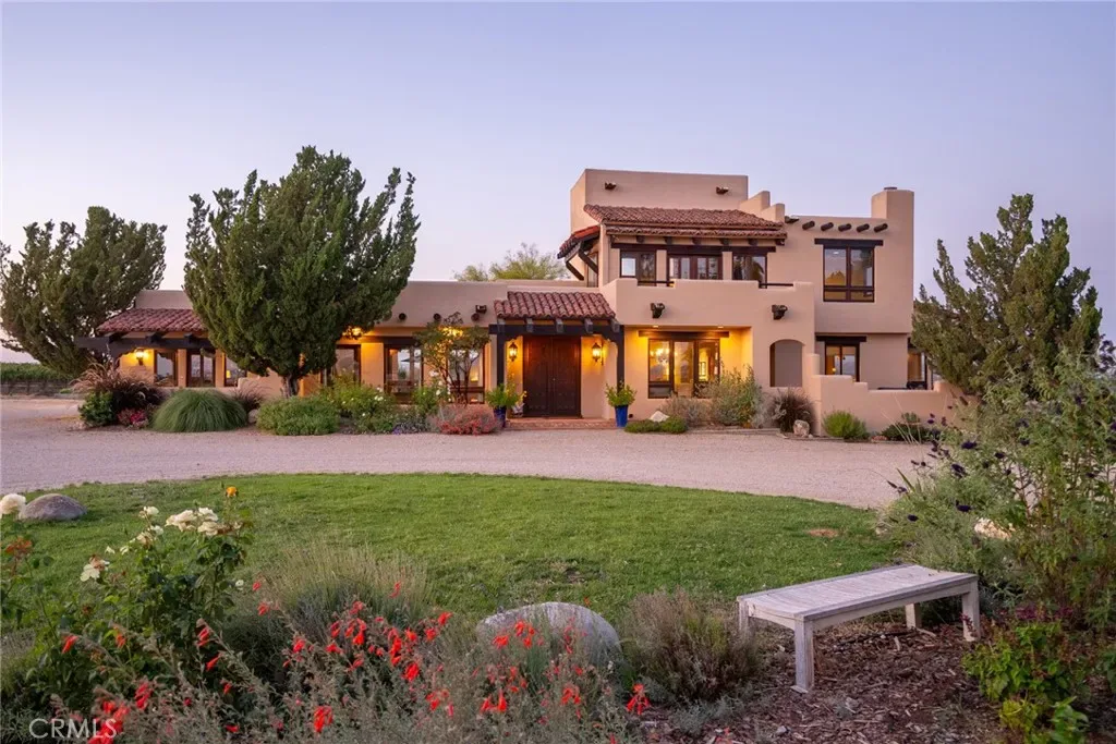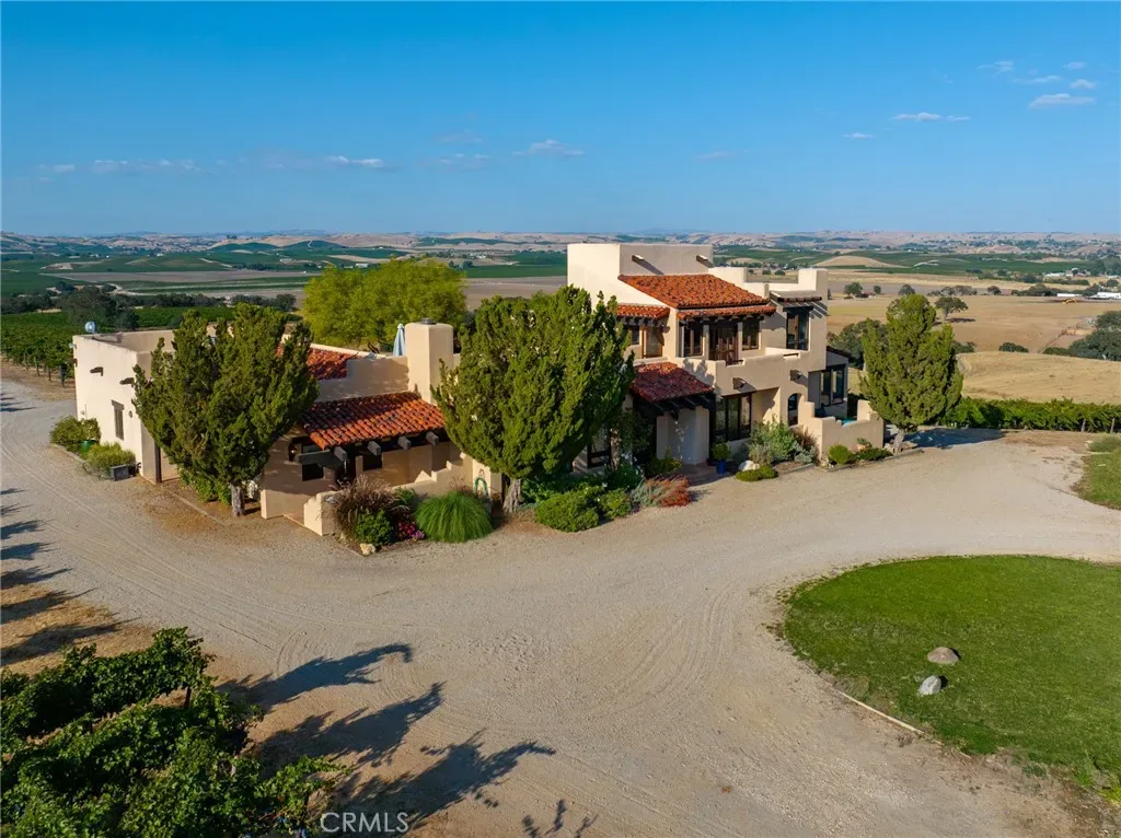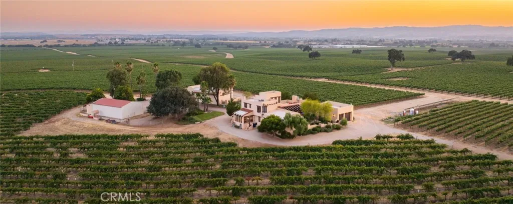 Wine country estate set across 52± acres in the heart of the Paso Robles AVA, commanding unobstructed views over 28.5± planted acres of Cabernet Sauvignon and expansive sunset horizons. The 3,869± sq. ft. custom residence is thoughtfully positioned to capture the surrounding vineyard vistas from nearly every room. A dramatic entry introduces Travertine flooring, exposed beams, and walls of windows that frame the landscape beyond. The open-concept living and dining areas transition seamlessly into a beautifully appointed kitchen designed for entertaining, featuring custom native black walnut cabinetry, a Viking 6-burner range with double ovens, under-counter microwave, Sub-Zero refrigerator, granite island, and quartz countertops. A casual dining area offers direct patio access, blending indoor and outdoor living. The primary suite serves as a refined retreat with recently updated Travertine flooring, new carpet and lighting, radiant heated floors, soaking tub, custom vanity, and frameless glass shower. Additional interior highlights include a dedicated office, art gallery hallway, wine cellar, and private outdoor patio with rooftop seating designed to embrace the panoramic setting. Equestrian amenities include a horse barn with two 12×12 stalls, attached one-bedroom casita suite, and approximately 4± acres of fenced horse pastures. A separate shop building with roll-up doors provides additional functionality for ranch operations. The property is supported by both agricultural and domestic wells, a solar array powering the vineyard and ranch improvements, and solar-operated entry gates. Enrolled in the Williamson Act, the estate benefits from reduced property taxes. Surrounded in every direction by vineyard rows and defined by architectural character, this Paso Robles estate represents the rare convergence of wine country production, equestrian infrastructure, and elevated living.