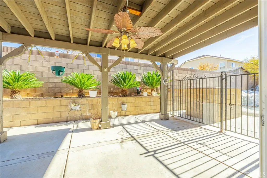 The backyard is a true private retreat showcasing a covered patio with lighting and ceiling fan, a designated outdoor dining space, and a gated rock-style pool with a shallow lounging ledge, natural stone coping, waterfall feature, and updated equipment. A fully owned 25-panel solar system and whole-house fan provide added comfort and energy efficiency.