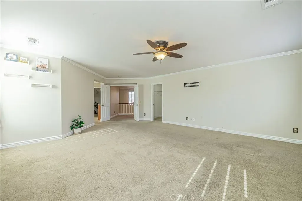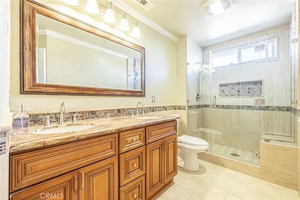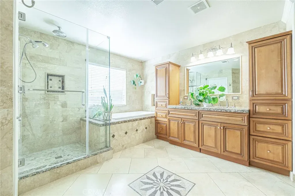 Upstairs, the expansive primary suite features dual walk-in closets and a beautifully remodeled spa-style bathroom with custom cabinetry, dual sinks, a soaking tub, and a stone-tiled shower. The additional bedrooms include ceiling fans, and both the upstairs secondary bath and the downstairs bath have been tastefully remodeled.