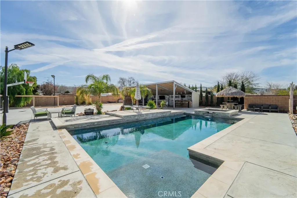LUXURY LIVING IN QUARTZ HILL ON AN ACRE LOT! This extraordinary custom estate, built in 2020, welcomes you through a private entry with an automatic gate, setting the tone for the luxury that awaits beyond. Situated on a sprawling one-acre lot, this home was thoughtfully designed for both elegance and functionality. Grand front doors open to an exceptional layout with tons of natural lighting featuring tall ceilings, a formal dining area, and a spacious living room anchored by a stunning stone fireplace and custom shelving. The gourmet kitchen is truly a showstopper with high-end stainless-steel appliances, double ovens, an oversized walk-in pantry, and seamless flow into the main living space perfect for entertaining. All four generously sized bedrooms include their own attached bathrooms, offering ultimate comfort and privacy with planation shutters giving each room a modern and clean style. The primary suite is a retreat of its own with two walk-in closets, a large custom walk-in shower, a relaxing garden tub, and private access to the backyard. The oversized three car garage provides ample storage space along with extensive RV access for all your toys and equipment. Step outside to your private entertainer’s paradise featuring a built-in pool and spa, covered patio, custom bar, and a basketball court. With room to build a future shop or guest home, the possibilities are endless. Solar panels help keep electric bills low. This home has it all. Call for your personal tour today!