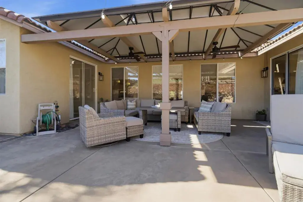 Nestled on a peaceful cul-de-sac in the highly sought-after Rancho San Vicente Estates, this beautifully maintained single-story home, built in 2000, offers 4 bedrooms and 2 baths with a spacious open floor plan. The heart of the home features a large, updated kitchen with quartz countertops, high-end cabinetry, and a seamless flow into the great room with a cozy fireplace—perfect for entertaining or relaxing with family. Enjoy formal dining and a generous living area, all enhanced by natural light and elegant finishes. Step outside to your private backyard oasis, complete with a low-maintenance artificial turf, blooming white roses, a covered patio ideal for entertaining, and a sparkling saltwater pool. RV parking adds convenience for outdoor enthusiasts. Additional features include leased solar, all-new flooring, fresh paint, and new window treatments throughout. The home includes two garages—one two-car and one single-car—plus a large driveway providing ample extra parking. A charming front courtyard adds curb appeal and a welcoming entrance. This home combines modern comfort with outdoor lifestyle, all in the tranquil setting of Ramona.