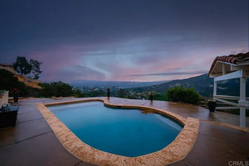 Come home to a resort everyday and you will never want to leave. This REMODELED stunner is close to brand new with jaw-dropping PANORAMIC VIEWS and tucked away at the end of a cul de sac. Resort style backyard with pebble tec POOL with huge baja step, cabana, palapa and horseshoe pit. 4 bedrooms + BONUS potential ADU below. Architectural details include soaring ceilings, plantation shutters, recessed lighting, laminate flooring, coffered ceiling and sunken living room. Dream primary suite features views forever, his and hers closets, soaking tub and separate shower. 3 car garage. All this and enjoy country club living in San Diego Country Estates with swimming, hiking, golf, tennis, pickleball and horseback riding.