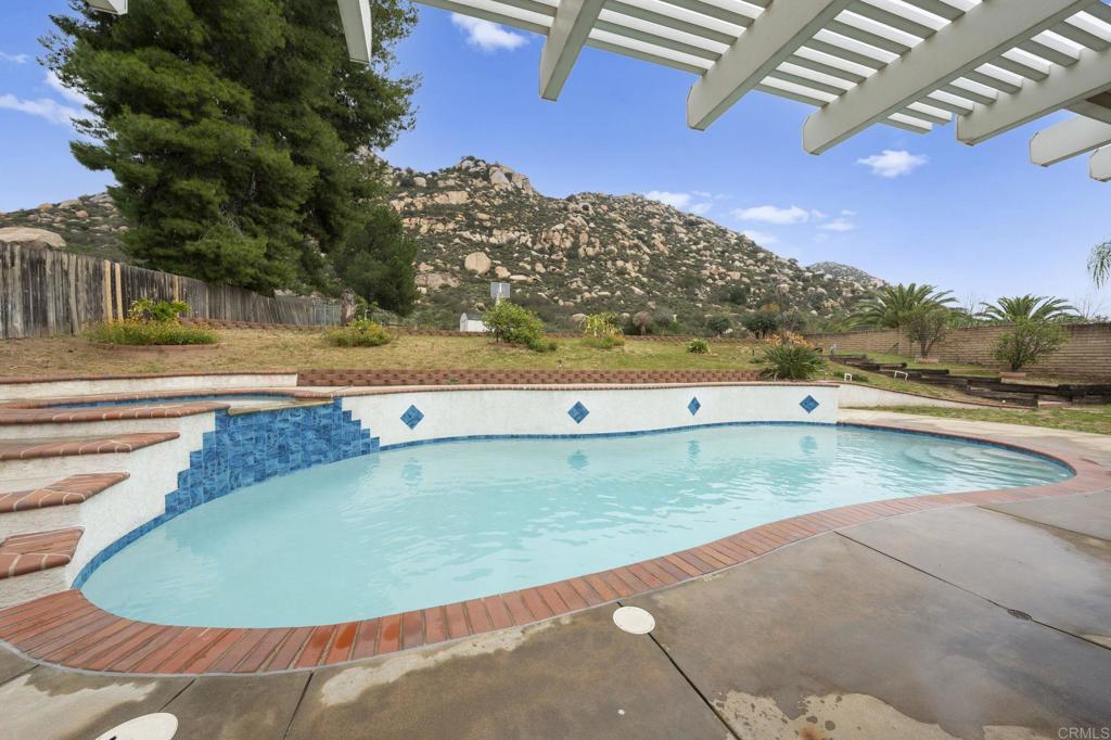 Welcome to 25072 Poderio Drive, a beautifully positioned single-family home in Ramona’s desirable San Diego Country Estates. Situated on a spacious approximately 0.58-acre lot, this well-appointed residence offers serene country living with room to roam. This classic ranch-style home features 3 generous bedrooms and 2 full bathrooms, with approximately 2,298 square feet of living space thoughtfully laid out for both everyday comfort and entertaining. Natural light fills the expansive interior, enhanced by upgraded double-pane windows and recessed cam lighting. Custom cabinetry throughout the kitchen and bathrooms, along with a charming built-in bookcase nook, adds warmth and character. Granite countertops extend seamlessly from the kitchen into the bathrooms, creating a cohesive and elevated design. A cozy wood-burning fireplace anchors the living space, perfect for cooler evenings. Step outside into your private backyard retreat, ideal for al fresco dining, gardening, recreation, or simply soaking in the peaceful surroundings. The fully fenced property offers privacy and versatility, complete with a basketball court and storage shed. The potential for this flat usable space is endless. The sparkling pool has been recently renovated with new plaster, coping, and flagstone, providing a refreshed and inviting space to relax on warm California days. A fully permitted sunroom and pergola off the primary suite create an ideal setting for morning coffee or quiet evenings outdoors as you gaze at your private mountain views. Additional improvements include brand new interior paint, a new water heater, and a new water filtration system — providing enhanced comfort, efficiency, and peace of mind. Set within a community celebrated for its scenic beauty and relaxed rural lifestyle — yet just a short drive to the conveniences of San Diego — this home offers close proximity to golf, hiking, equestrian trails and facilities, parks, and the many amenities of San Diego Country Estates, while remaining conveniently connected to local schools, shopping, and everyday services. 25072 Poderio Drive combines thoughtful upgrades, spacious living, and exceptional outdoor amenities in a premier Ramona location — a rare opportunity for those seeking comfort, quality, and country charm.