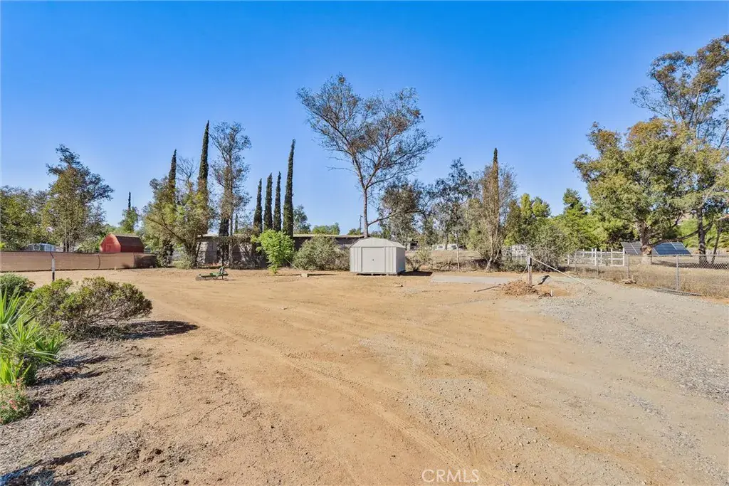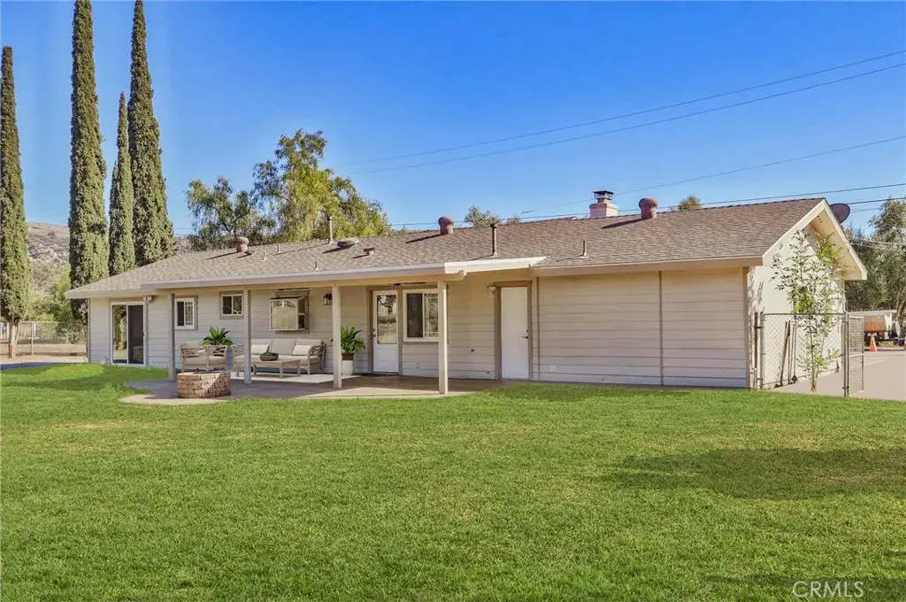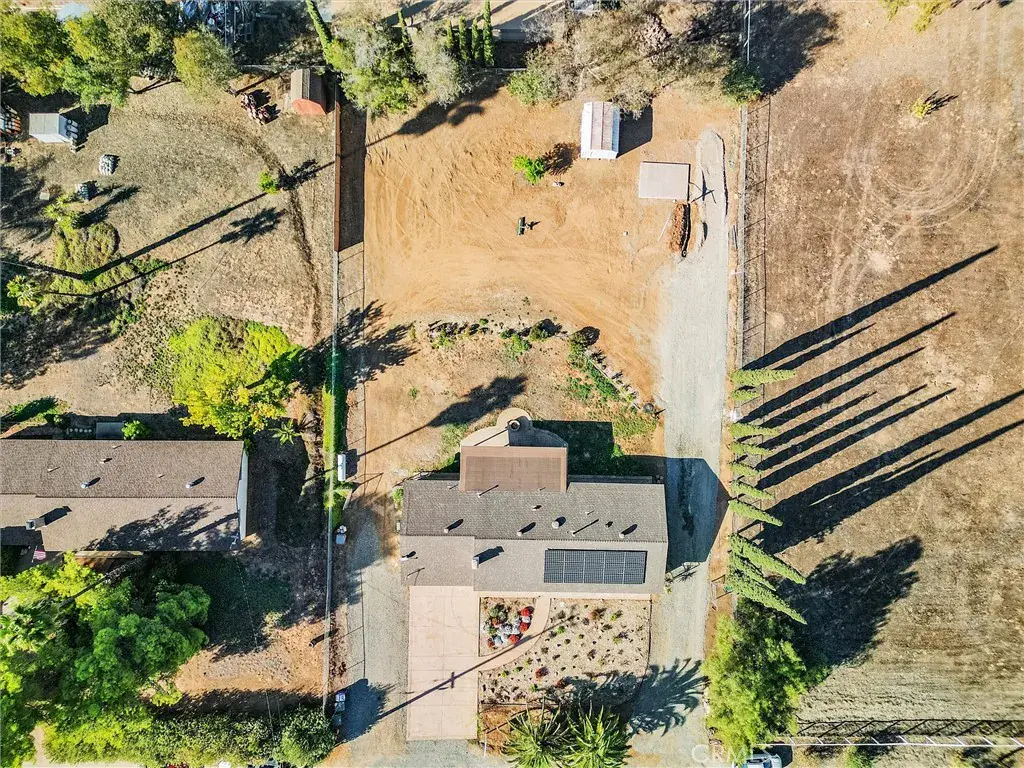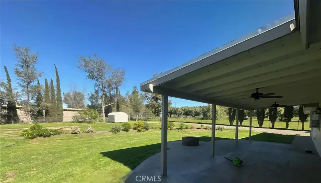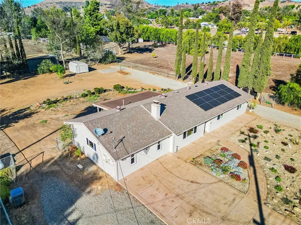 Step outside to an expansive fully fenced backyard featuring a metal shed, a 10×14 foot slab ready for a shop/or shed, a covered patio with misters, stamped concrete, and a propane firepit—ideal for entertaining. The yard also has two drive through 12 foot gates. The front of the home boasts a large 6-inch steel-reinforced, colored, and stamped concrete driveway with sidewalks and newly installed waterwise landscaping. Additional highlights include a newer roof with transferable warranty, paid solar, RV parking with a 50 Amp panel, an owned propane tank, a backyard sprinkler system, as well as front and backyard drip irrigation all on timers. There is a view of the hills from the front of the home, and the location could not be more ideal as it is located on a private quiet road.