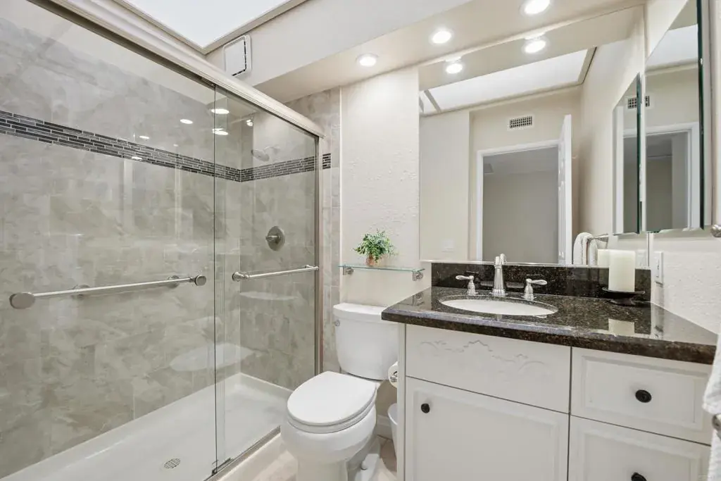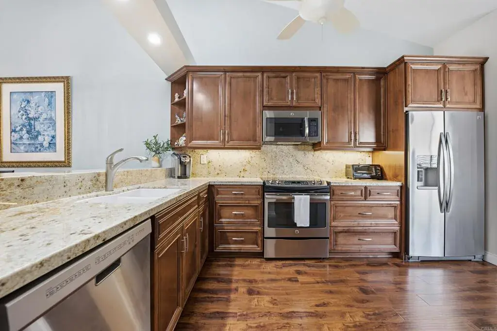 Oaks North, 55+ Active Adult Community, at it’s finest! When you first walk in through gate you will notice a spacious, quiet private courtyard perfect for your morning coffee. Living room shows light, bright and open with vaulted ceilings, skylights and slider to back patio. There is upgraded wood flooring throughout home. The open kitchen floorplan will take your breath away with updgraded cabinetry, appliances, granite counter tops and direct access to the garage. Each bathroom has a beautiful vanity and custom features. The primary bedroom has ample space with slider to the back private patio. Back patio offers parklike setting with views of community grassy area. Oaks North is an active adult community that has community clubhouse, exercise room, pool & spa, tennis, pickleball and lawn bowling courts. Various classes are offered for all different interests. The Rancho Bernardo Winery is located approximately one mile to the East and the Oaks North Golf Course is one mile to the South.