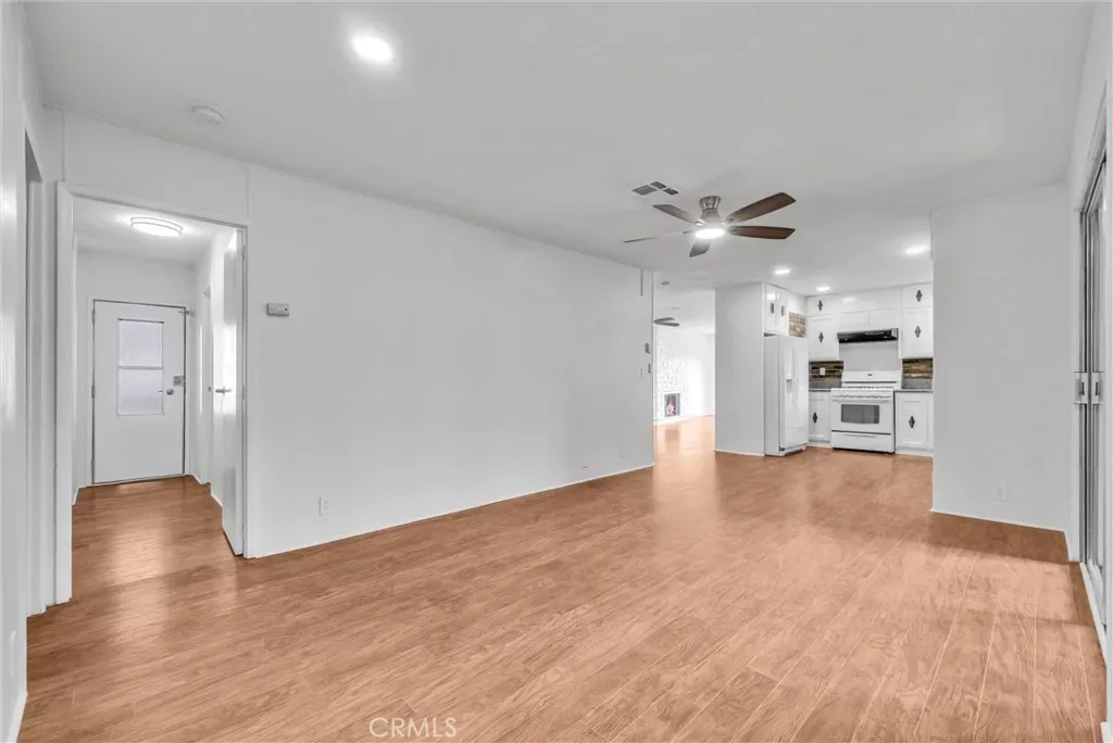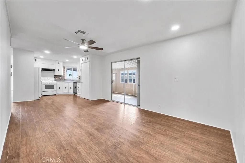 The large living room provides an inviting space for relaxing or entertaining guests. Just beyond, the kitchen offers ample cabinetry and counter space and flows easily into the dedicated dining area, creating a practical and comfortable space for everyday meals and gatherings.