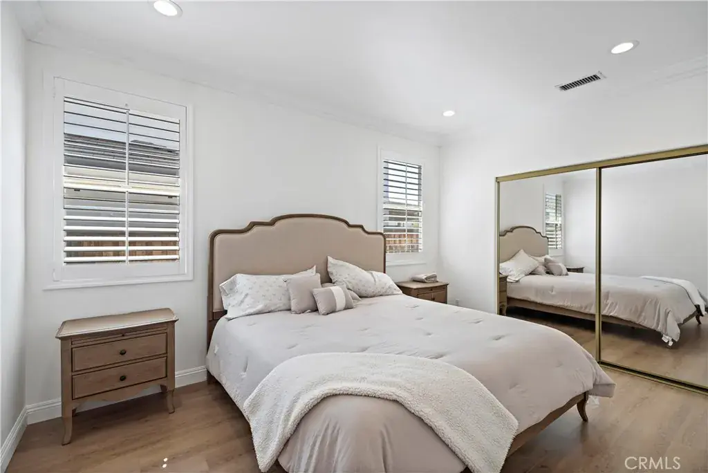 Beautifully upgraded 4 bed, 3 bath home located in the desirable Jolimont community of Rancho Cucamonga. This spacious and airy two-story home features fresh interior paint, recessed lighting, upgraded flooring, crown molding, and designer draperies throughout. The gourmet kitchen is equipped with new white cabinetry, granite countertops, and a Wolf high-performance range, opening to a large family room—perfect for entertaining.Downstairs includes a full bedroom and remodeled bathroom with Spanish tile and a large walk-in shower, ideal for guests or multi-generational living. Upstairs, the oversized primary suite offers a retreat space that can be used as an office, lounge, or optional 5th bedroom. The spa-like primary bathroom has been remodeled with elegant marble tile throughout. All bedrooms are spacious with ample closet space and new mirrored doors.