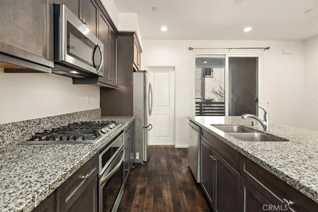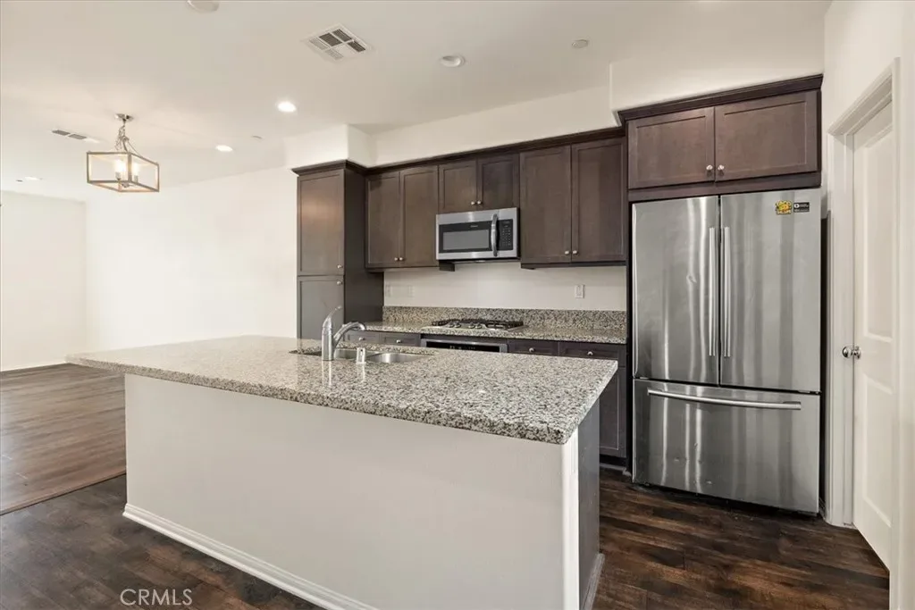Upon entering this remarkable condo, step into the open-concept main floor highlights a gorgeous kitchen, boasts granite countertops, shaker-style espresso-colored cabinets, and is fully equipped with a stove top, built-in oven and microwave, dishwasher, and refrigerator – all included for your convenience.