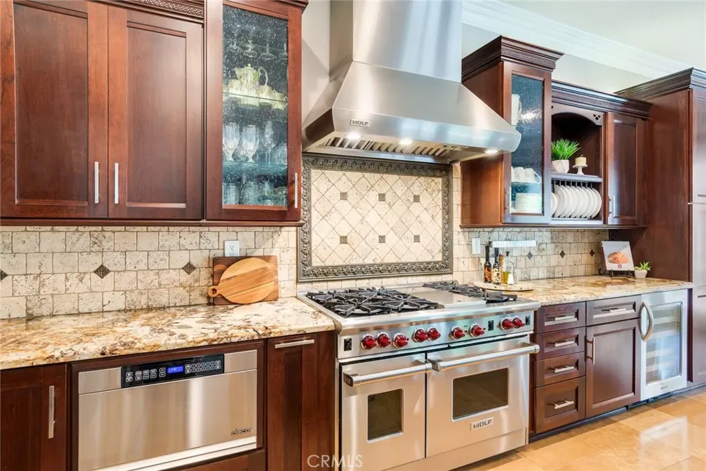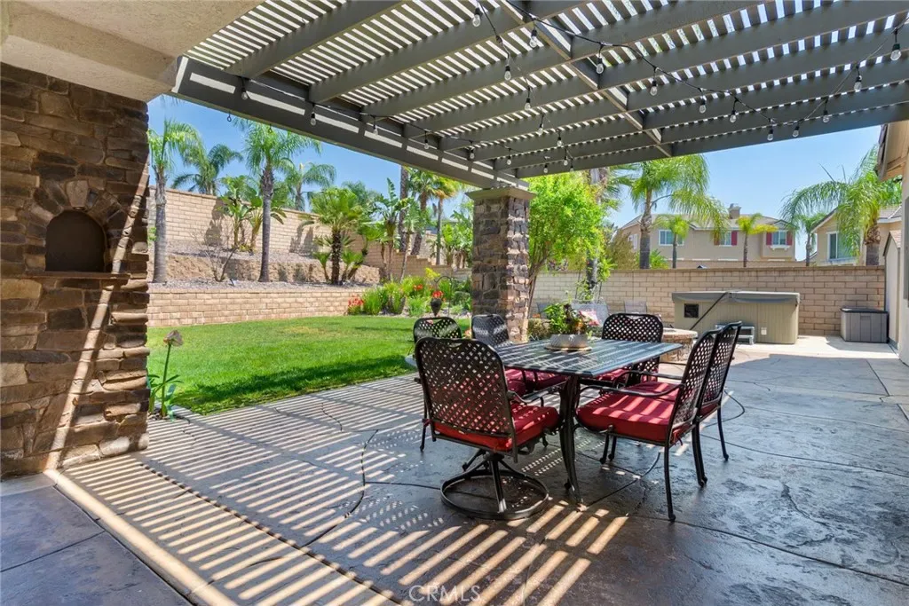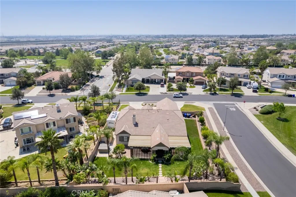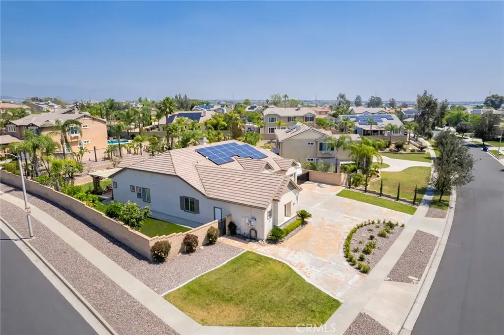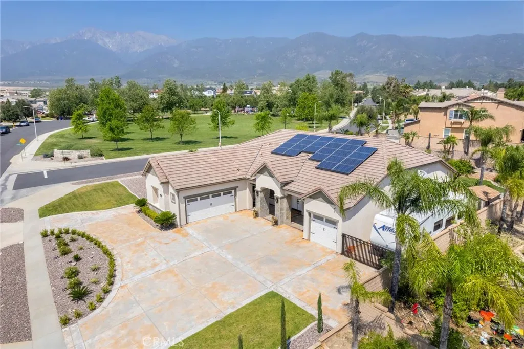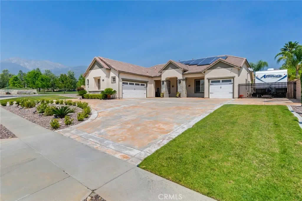 Beautiful Single Story home with 4 Bedrooms, 3 baths, 3 car garage, large circular driveway and RV Parking! Located in a highly desirable neighborhood of North Etiwanda with Award Winning School District. Featuring PAID OFF Solar! with Built-in EV Charger, offering convenience for eco-friendly living, a generous .41 acre lot with enough room to build a pool. This property offers exceptional curb appeal, an abundance of natural light and functionality. Step inside to a welcoming foyer framed by a formal sitting room and an elegant formal dining room with high ceiling and lovely crown molding. The home opens into a large, open concept living area showcasing a Chef’s Kitchen complete with a large granite island, high-end appliances including a Wolf 6 burner Range, double ovens with large stainless steel Wolf Range-hood, microwave, built-in ice maker, wine fridge and built-in in Refrigerator- perfect for cooking and entertaining. The Family room has a gorgeous Built-in entertainment center with a 70′ TV and side shelving. The Backyard is a true retreat with a full length patio, ideal for gatherings of any size. Enjoy evenings around the built-in fire pit or unwind in the jacuzzi spa, both included in the sale. Professionally landscaped yard has many different fruit trees around the back perimeter adding charm and privacy.