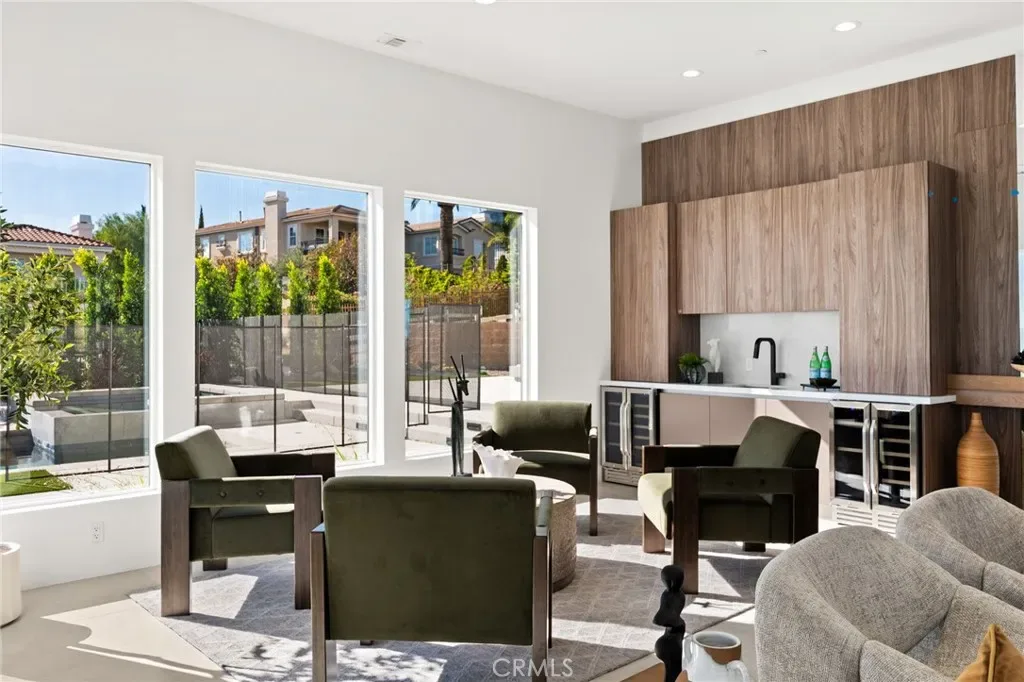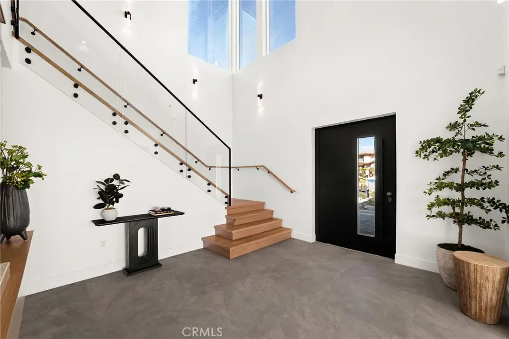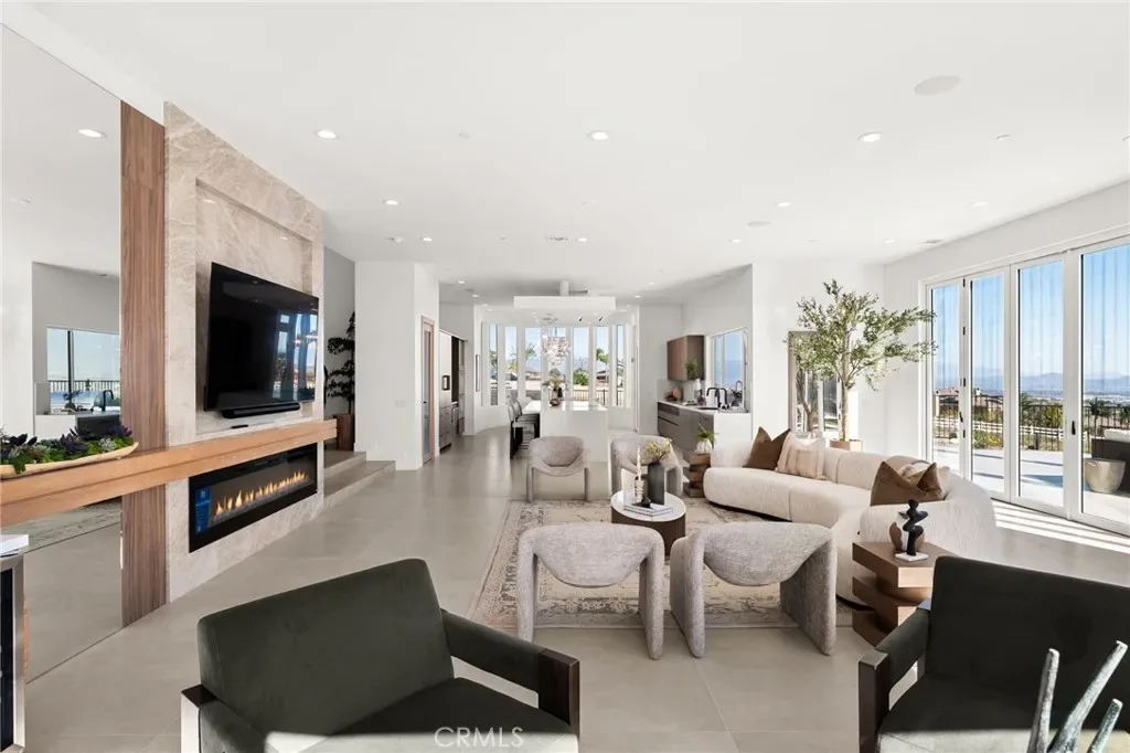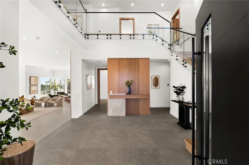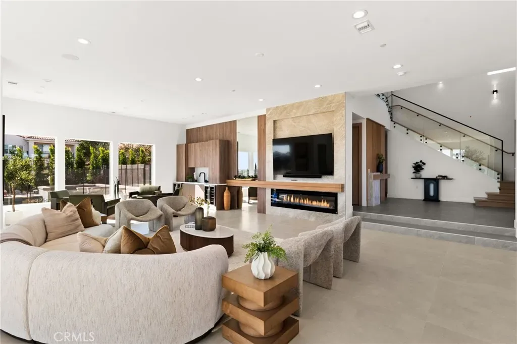 A striking 27-foot glass tower and floating portico announce your arrival, opening to a grand foyer defined by soaring ceilings and a sculptural glass staircase. The main living level is anchored by an 18-foot feature wall clad in slab marble with a fireplace, integrated bar, and expansive disappearing glass walls that dissolve the boundary between interior and resort-inspired grounds.