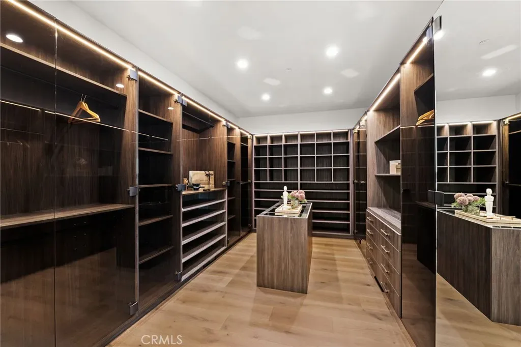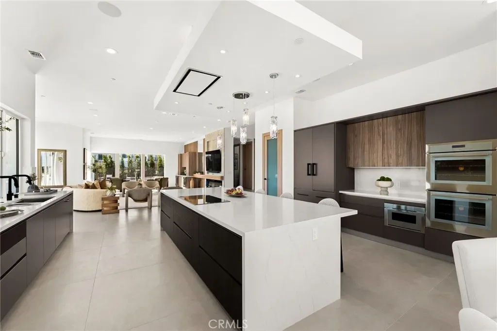 Outside, 22-foot steel columns frame a covered patio overlooking a modern pool and elevated spa, meandering water features, a vineyard, orchard, and meticulously manicured lawns — all conceived for privacy, serenity, and visual harmony. The chef’s kitchen is a triumph of design, featuring Italian Stosa cabinetry, a dramatic 12-foot waterfall island, and fully integrated Thermador appliances.