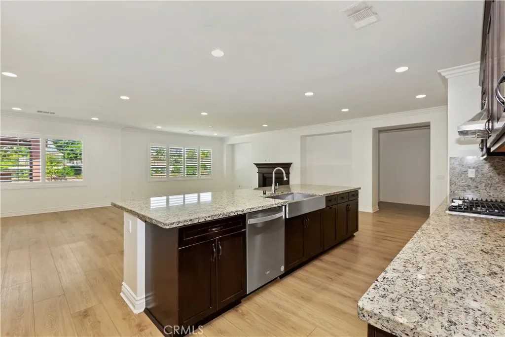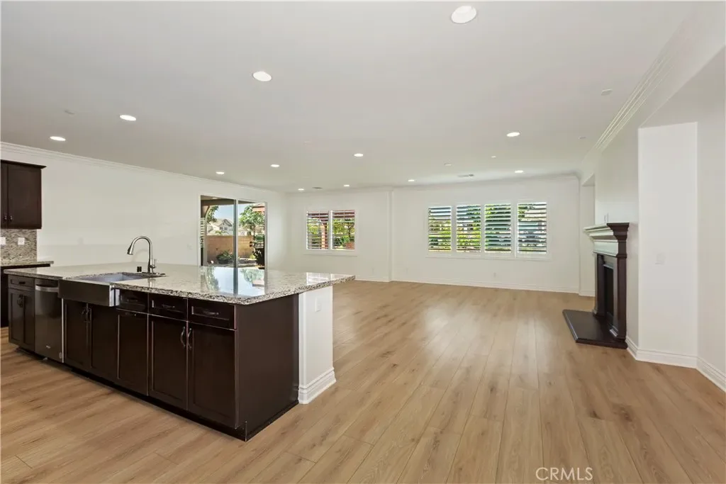 Inside, wood-look tile flooring flows throughout the home, complementing the open-concept layout and soaring ceilings that create a true sense of grandeur. The chef’s kitchen is equipped with stainless steel appliances, a large center island, and a walk-in pantry, all opening to the spacious family room with an elegant accent fireplace and abundant natural light.