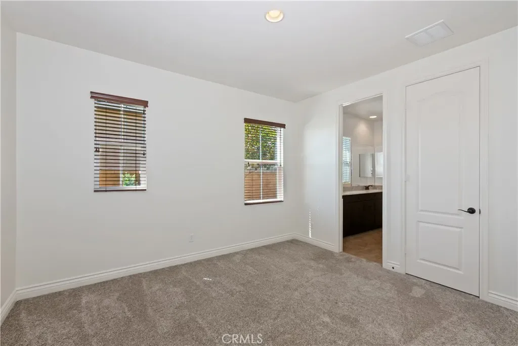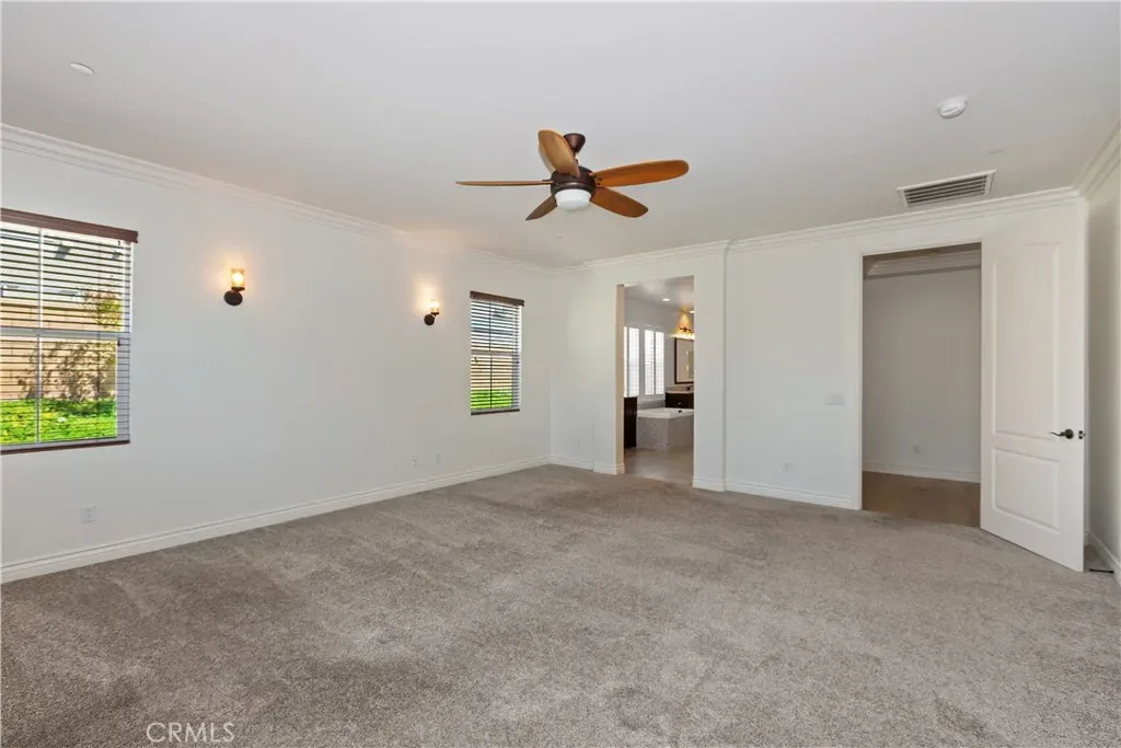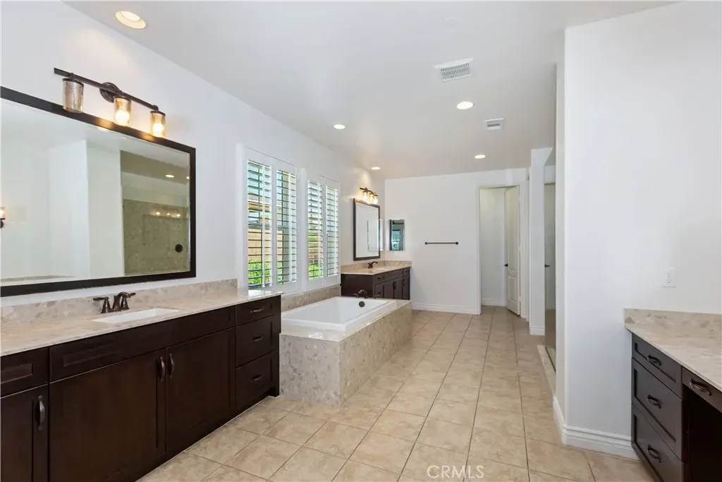 The primary suite is a serene retreat, complete with sconce lighting, plantation shutters, and a spa-inspired bathroom featuring dual vanities, a dedicated makeup counter, a walk-in tiled shower, a soaking tub, and an expansive walk-in closet.