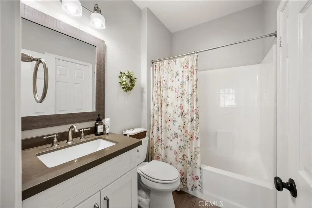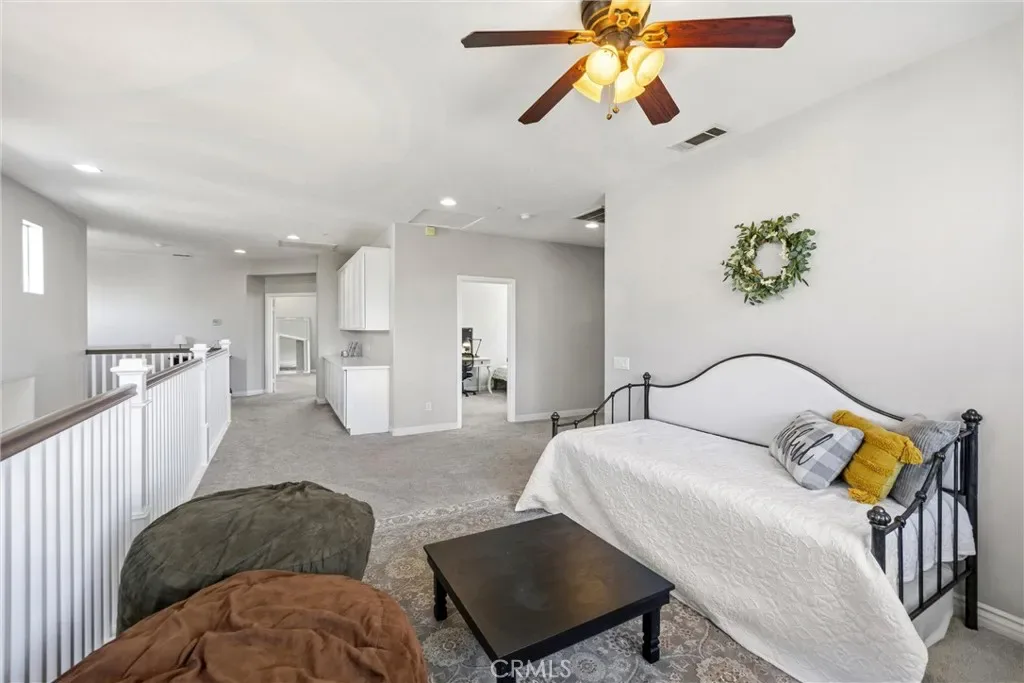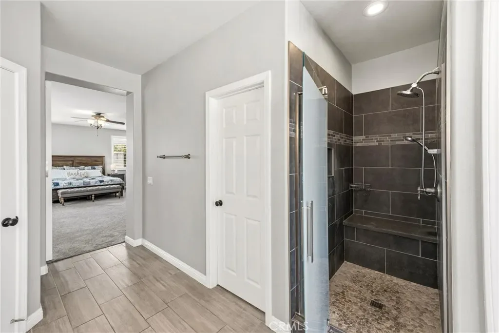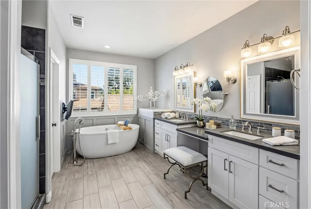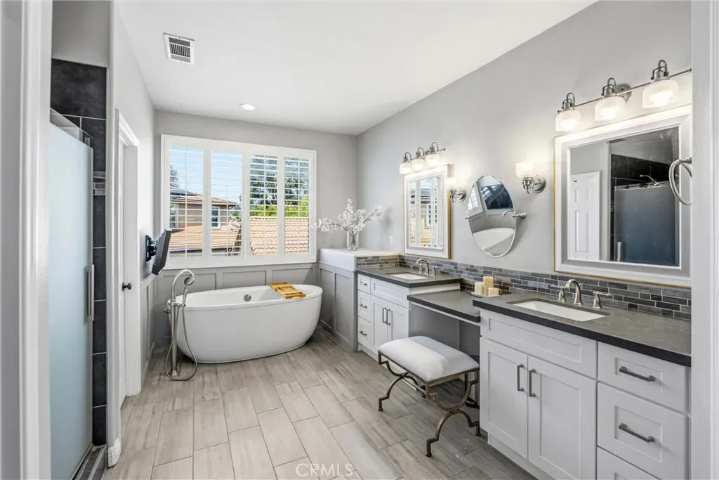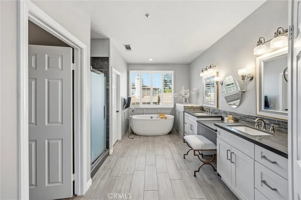 Upstairs includes a generous loft that works perfectly as a kids’ playroom, homework/study area, or additional family hangout space, giving everyone room to spread out and stay connected. Two bedrooms connected by a Jack-and-Jill bathroom with dual sinks. The primary suite features dual walk-in closets and a bathroom with separate vanities, a built-in makeup area, soaking tub, and a glass-enclosed walk-in shower.