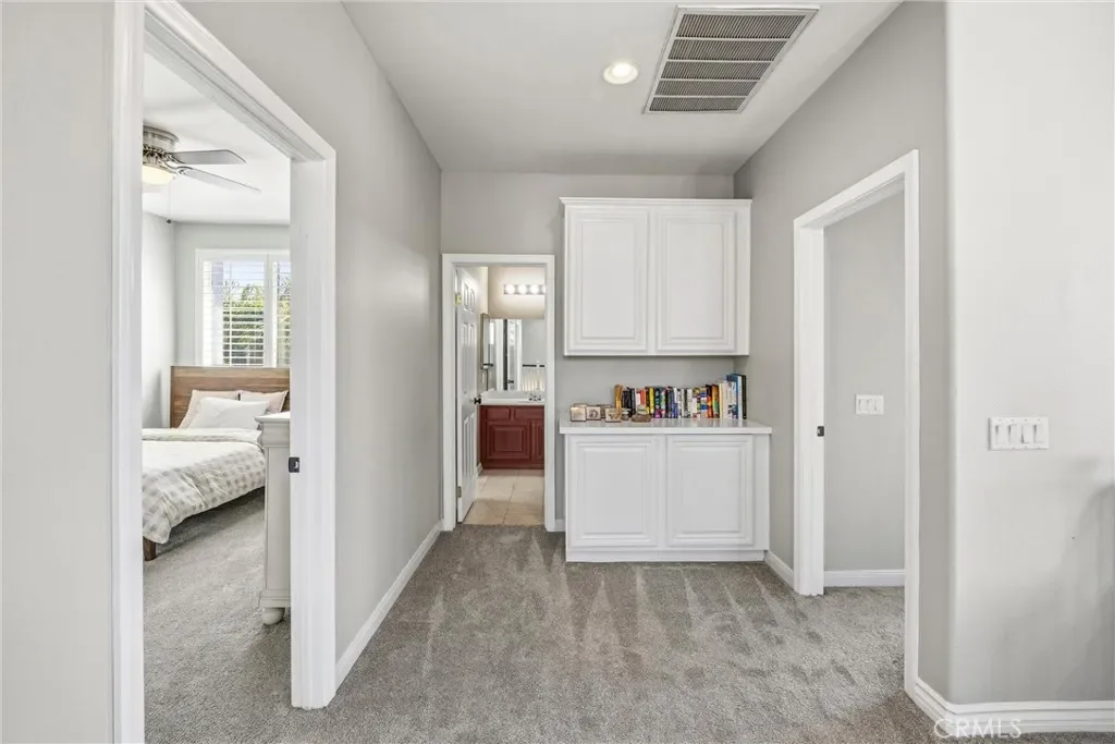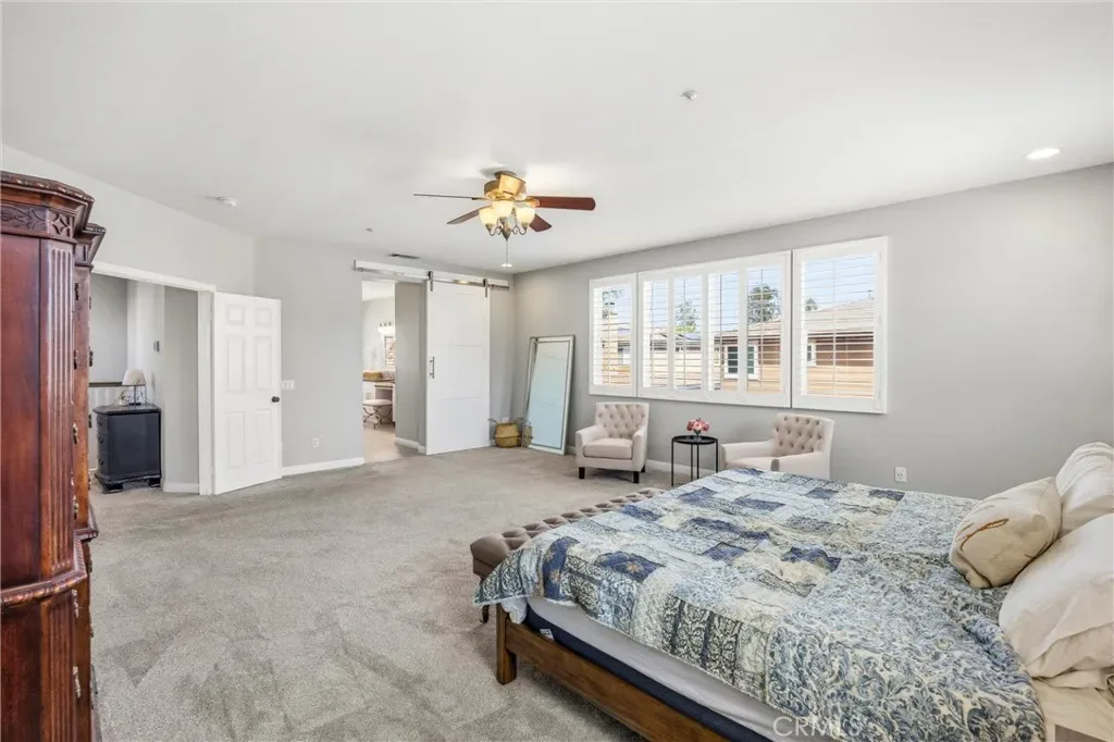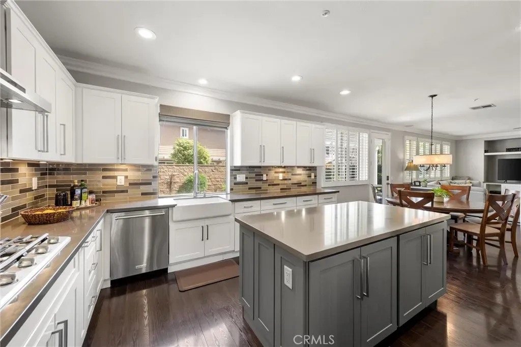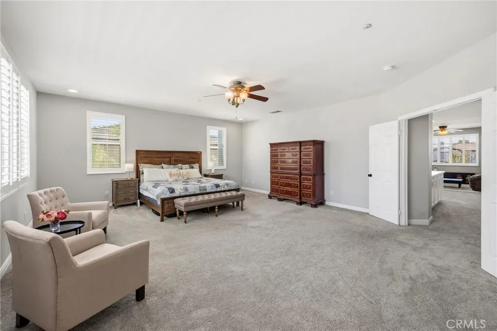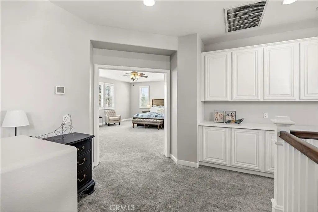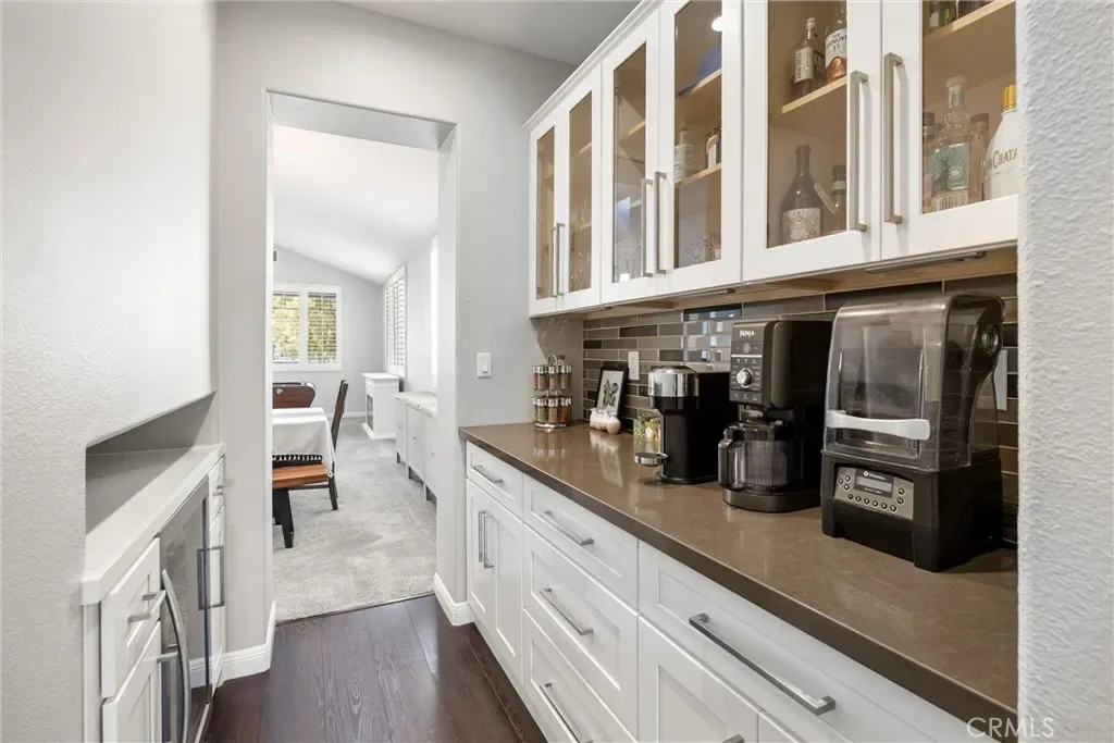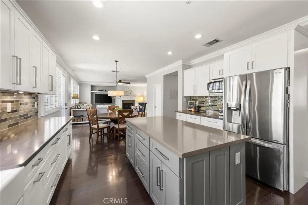 The main level features vaulted ceilings, a spacious living and dining area, and a versatile office that can easily be converted into a bedroom with an adjacent bathroom—perfect for an in-law or guest setup. The kitchen is designed for both function and style, featuring shaker-style soft-close cabinetry and drawers, quartz countertops, glass backsplash, an oversized island, double ovens, a walk-in pantry, and a butler’s pantry with a built-in wine refrigerator. The kitchen opens to a large family room with built-in cabinetry, a fireplace, crown molding and plantation shutters.