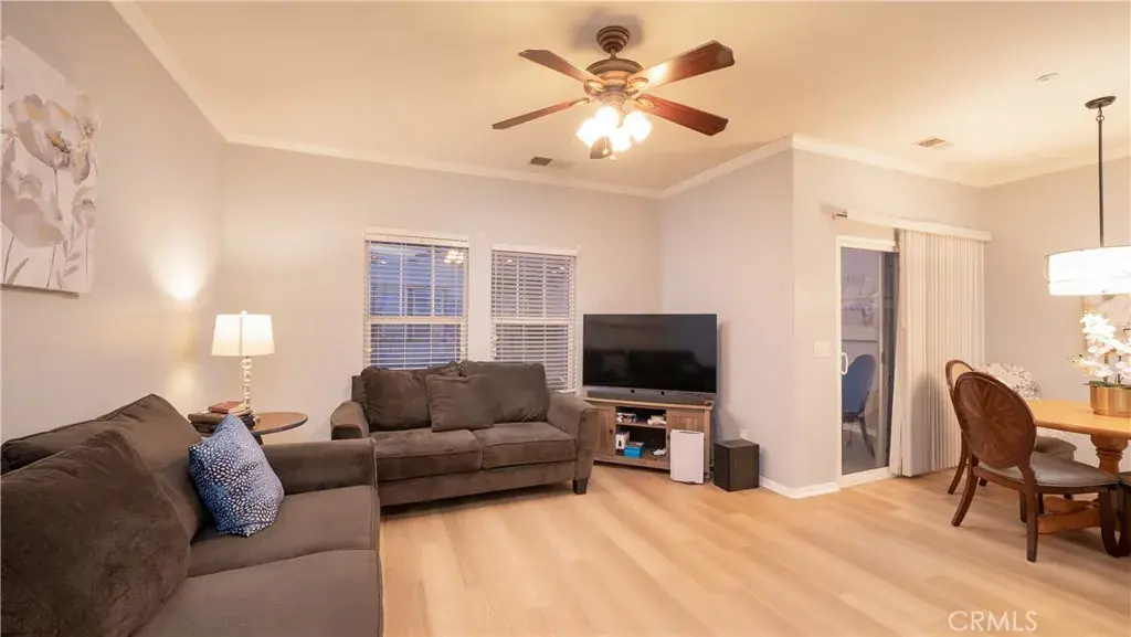 New vinyl luxury plank flooring and fresh paint run throughout the home, complemented by crown molding, recessed lighting, and ceiling fans throughout. The open, bright floorplan creates a welcoming feel, with the kitchen opening directly to the family room and dining area. A balcony off the main living space adds even more light and openness. The kitchen features an etched glass pantry door for a small walk in pantry, granite countertops with a full backsplash, and GE appliances. Bedrooms are equipped with ceiling fans, and the primary bedroom includes a private balcony overlooking the neighborhood with mountain views. The full bathroom includes a tub and shower combo, dual sinks, and a granite countertop. A convenient indoor laundry closet with built-in shelving. HOA amenities include a peaceful, park-like play area, plenty of greenbelts, a BBQ area with picnic tables and benches, and a large pool area with spa, perfect for summer entertainment. Overall, a quiet, peaceful location located close to shopping and easy freeway access.