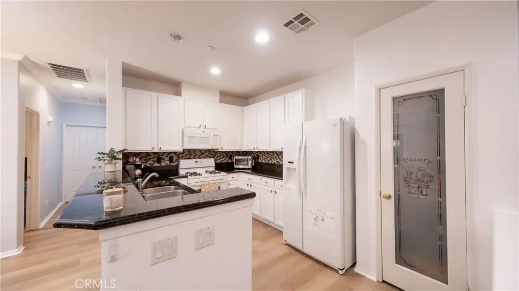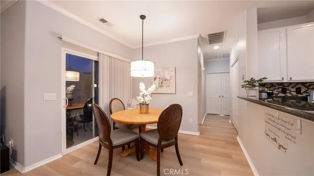 Newer luxury vinyl plank flooring and fresh paint run throughout the home, complemented by crown molding, recessed lighting, and ceiling fans throughout. The open, bright floorplan creates a welcoming feel, with the kitchen opening directly to the family room and dining area. A balcony off the main living space adds even more light and openness. The kitchen features an etched glass pantry door for a small walk in pantry, granite countertops with a full backsplash, and GE appliances. Bedrooms are equipped with ceiling fans, and the primary bedroom includes a private balcony overlooking the neighborhood with mountain views. The full bathroom includes a tub and shower combo, dual sinks, and a granite countertop. A convenient indoor laundry closet with built-in shelving. HOA amenities include a peaceful, park-like play area, plenty of greenbelts, a BBQ area with picnic tables and benches, and a large pool area with spa, perfect for summer entertainment. Overall, a quiet, peaceful location located close to shopping and easy freeway access.