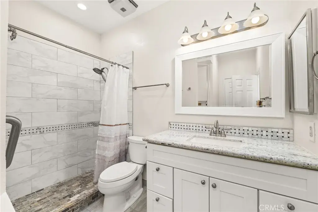 The bathroom has been tastefully updated with a full tile shower surround, built-in niche, and updated vanity with quartz counter, complementing the home’s cohesive design.