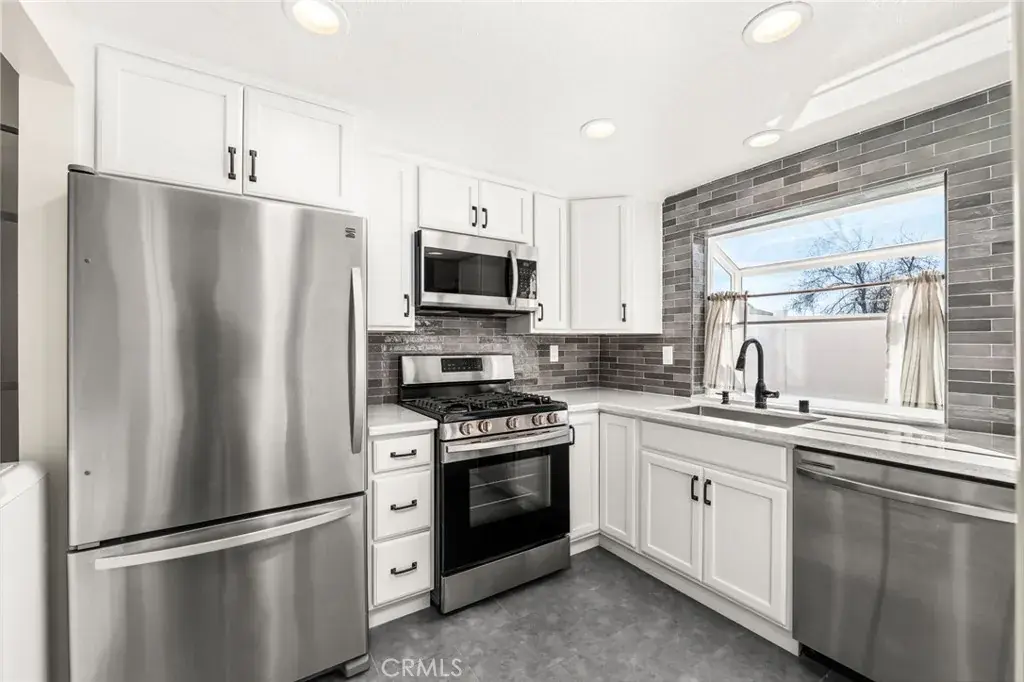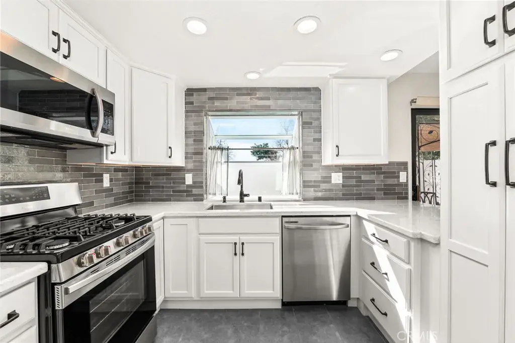 The fully remodeled kitchen showcases crisp white cabinetry, stunning quartz countertops, stainless steel appliances, and a modern tile backsplash. The open layout flows seamlessly into the dining area and out to a private patio with pergola, creating an ideal indoor-outdoor setting for relaxing or entertaining.