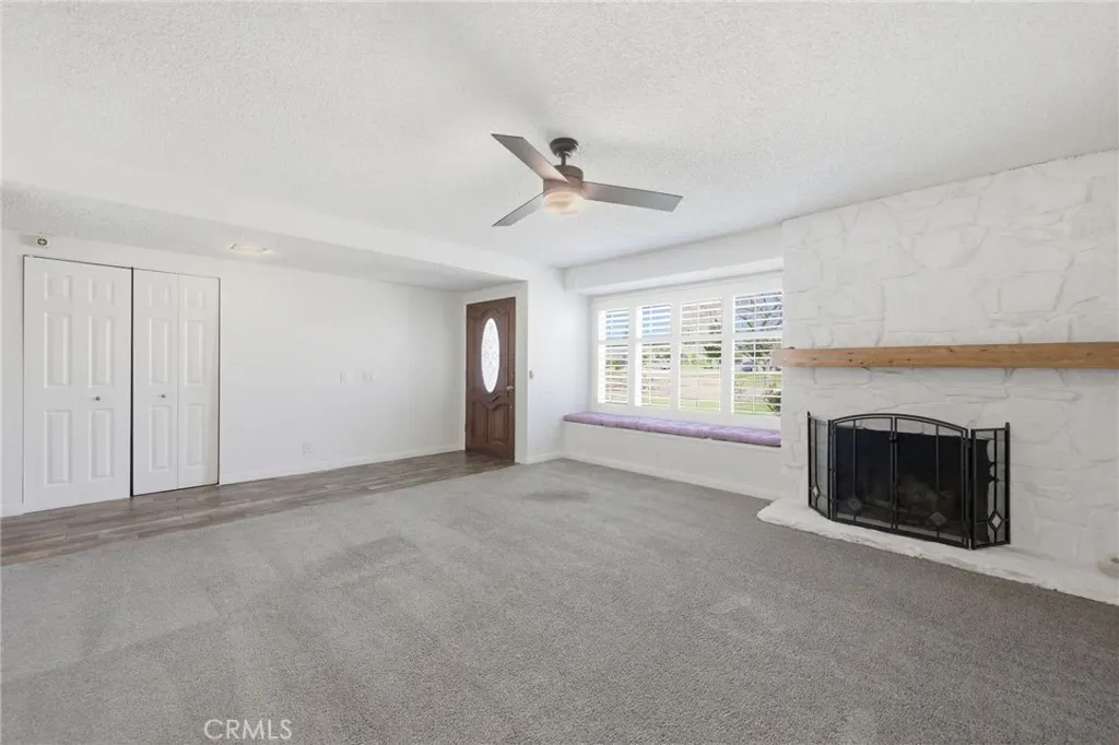 The living room offers a cozy fireplace, large window seating area, and plenty of natural light—creating a warm and welcoming place to relax and unwind.