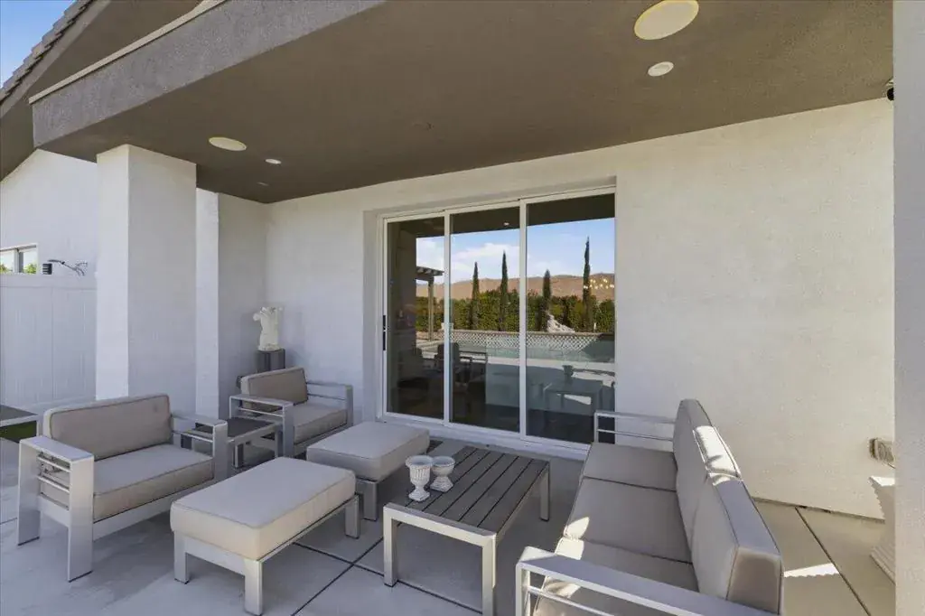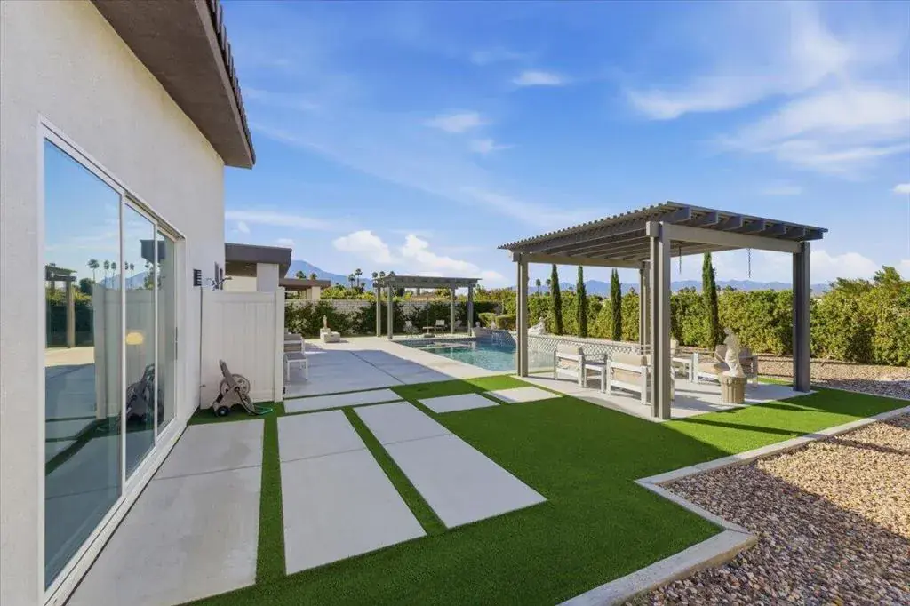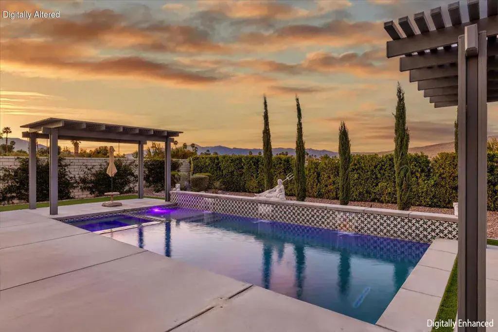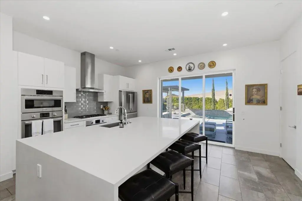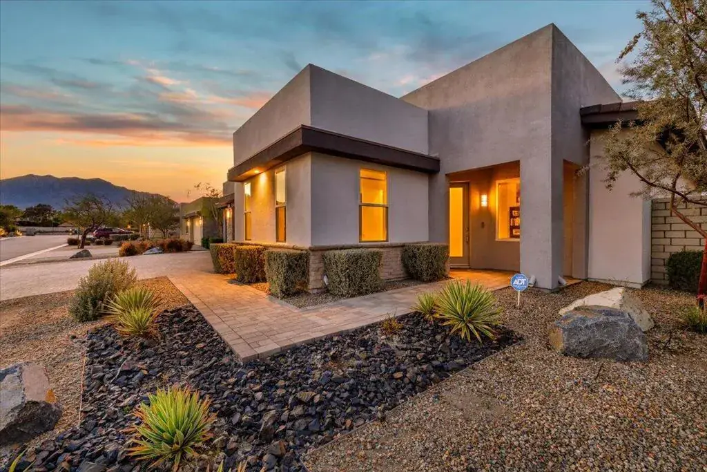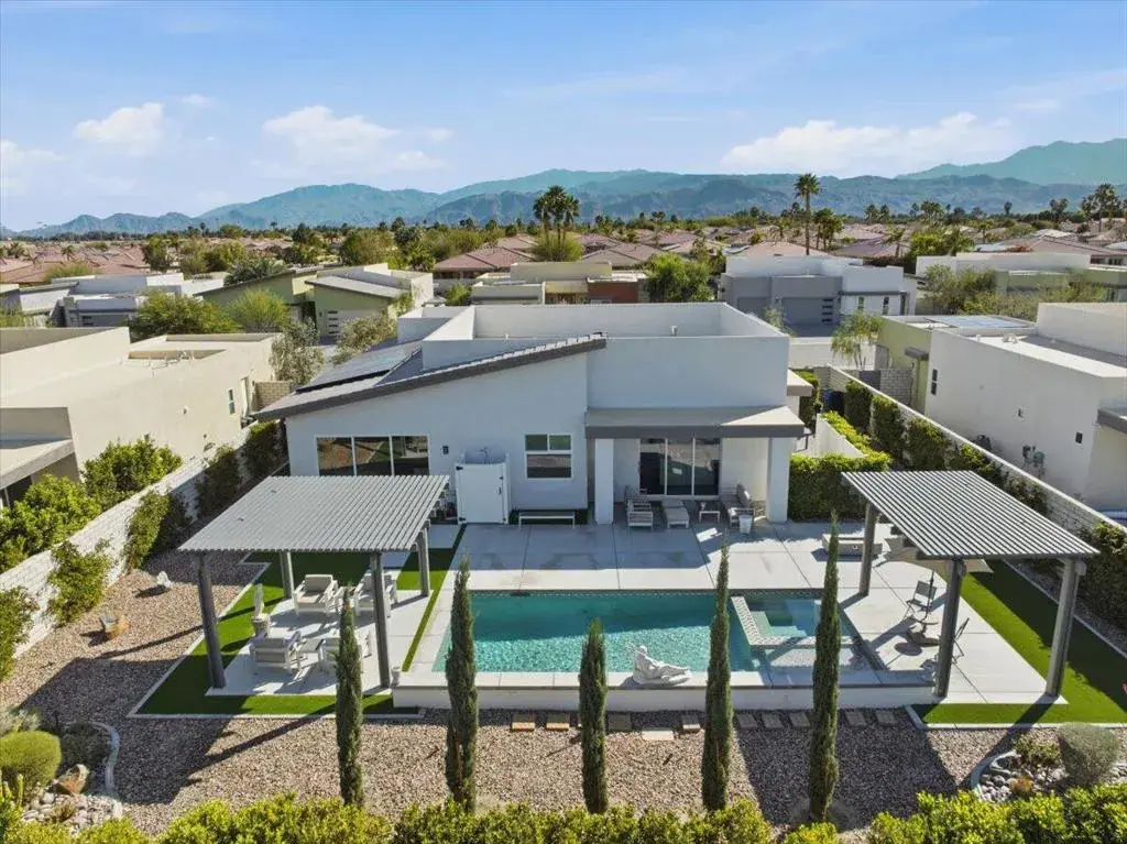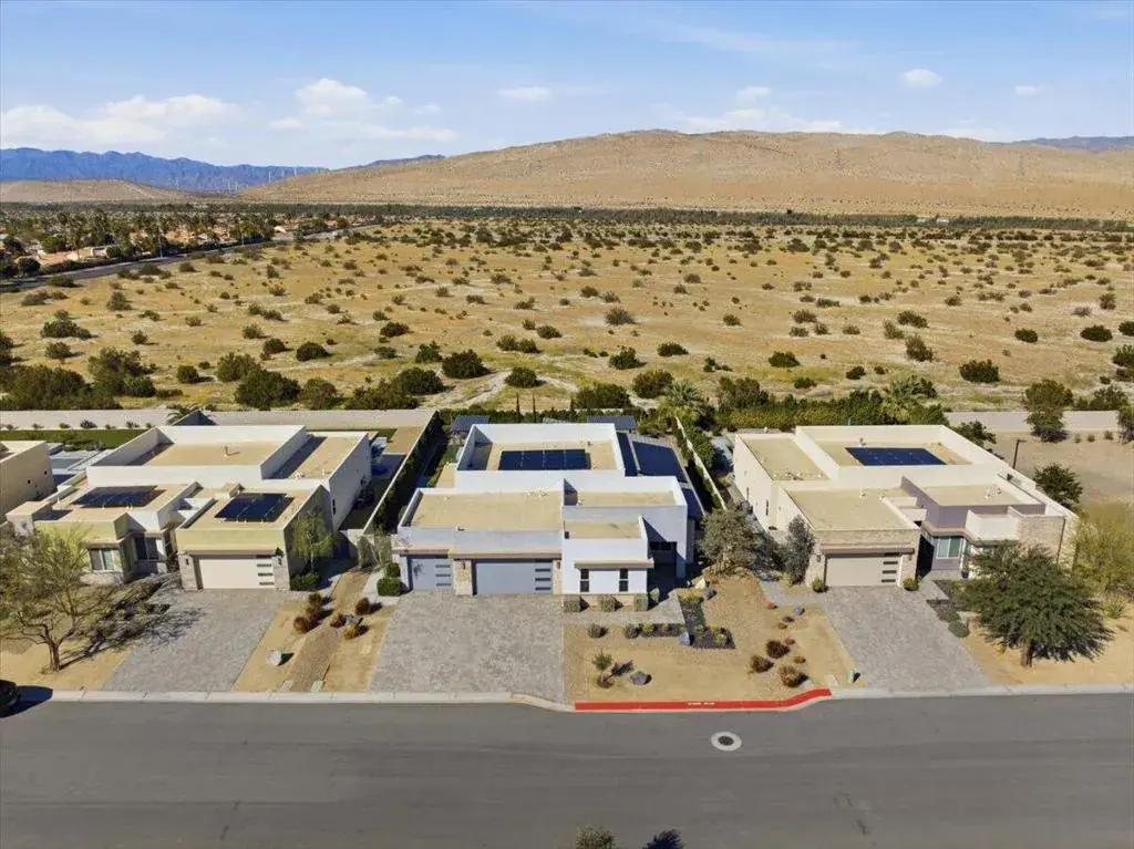 Tucked inside Iridium, a boutique gated enclave of just 27 New Century Modern residences in Rancho Mirage, this newer home channels the clean lines and easy elegance of classic desert design–reimagined for today’s lifestyle. Inspired by the mid-century movement that shaped the Coachella Valley, this fully equipped mini estate delivers a polished blend of luxury, comfort, and effortless indoor-outdoor living.Inside, an open great-room layout is elevated by soaring 10-foot ceilings, recessed lighting, and expansive multi-slide doors that dissolve into two private outdoor patios–perfect for morning coffee, golden-hour cocktails, and everything in between. The resort-style backyard takes center stage with a Neptune-inspired saltwater pool and spa, outdoor shower, and fire pit, all framed by tranquil panoramic mountain views–including twilight skies with sightlines toward San Jacinto and Big Bear.Designed with privacy in mind, the home offers four bedrooms. The primary suite is a serene retreat with an oversized shower, accent-lit double vanity, and a generous walk-in closet. The gourmet kitchen flows seamlessly into the great room and wet bar, featuring top-tier stainless appliances and a quartz slab island–tailor-made for entertaining.Modern conveniences include a whole-home water purification + softener system, tankless water heater, smart lighting and home features, high-speed data wiring, and owned solar–a crisp, contemporary take on iconic desert living at its most refined.