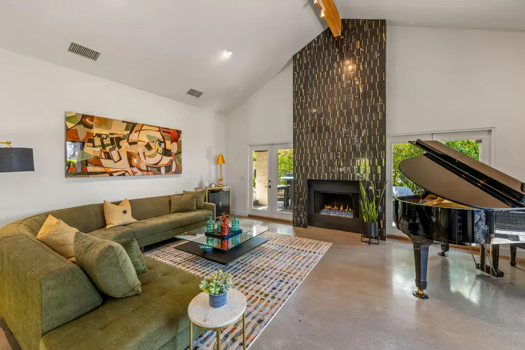 Gorgeous redone home in the quiet location at the back of a lush, gated Spanish complex filled with greenbelts. All 3 bedrooms are en-suite with entries separated from each other for privacy and each open to their own outdoor space. Large Formal entry. Livingroom with high Vaulted ceilings, elegant dramatic tiled Fireplace, tiled Bar, and glass doors leading out to multiple Patios with views of the Mountains. Dine under the statement Chandelier or an exterior patio for al fresco dining. Modern cooks’ kitchen with vaulted ceiling, stainless-steel appliances, warm paneled cabinets with tons of storage, honed granite countertops. Have breakfast overlooking the front courtyard or at the bar. The home sits next to an expansive manicured greenbelt that is like having your own lawn. The oversized primary bedroom has vaulted ceilings and the bathroom has double sinks, a walk-in closet, a private outdoor shower and soaking tub surrounded by bamboo. The home has been beautifully altered and designed with a modern sensibility. Newer roof, fountains, art-lights and gallery walls. Newer paving stones line the driveway and outdoors. Huge Attic for additional storage! Immaculate and ready to move right in. This is a home like no other!