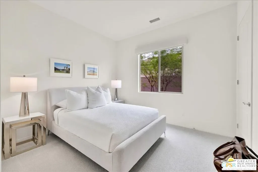 Perimeter View Home with Mountain Backdrop in Del Webb Rancho Mirage. Ideally positioned along the perimeter of the community, this Phase 6, Plan 3 Expedition with Tuscan facade offers unobstructed mountain views and a peaceful setting within the highly sought-after Del Webb Rancho Mirage community. This newer, energy-efficient home features 2 bedrooms, 2 baths, and a versatile flex space, thoughtfully designed for comfortable everyday living. Inside, the home showcases expanded 12-inch tile flooring, custom designer window treatments, and the desirable Arch package throughout, creating a warm and inviting atmosphere. The centrally located kitchen serves as the heart of the home, featuring natural granite countertops, 42-inch upper cabinetry, and additional pendant lighting above a generously sized island with ample seating. A stainless steel Whirlpool appliance suite with convection oven and microwave, along with a convenient walk-in pantry, adds both style and functionality. From here, the kitchen flows effortlessly into the dining and living areas, where natural light and beautiful views of the surrounding mountains enhance the open-concept design. The primary suite is spacious and relaxing, offering mountain views and a well-appointed ensuite bath complete with a glass-enclosed stall shower with bench seating, dual undermount sinks, and a large walk-in closet. Located toward the front of the home, the flex space/den is currently used as an office but can easily serve as a media room, hobby space, or wellness retreat. Just beyond, you’ll find the upgraded pass-through guest bathroom, featuring a glass-enclosed shower-over-tub combination and generous linen storage, which is conveniently located near the secondary bedroom with its own walk-in closet. Step outside to a fully landscaped backyard designed for easy desert living, featuring a covered patio ideal for outdoor dining and relaxation, along with drought-tolerant trees and shrubs, decorative river rock accents, and a clean, low-maintenance landscape that complements the beautiful mountain backdrop. The laundry room is well equipped with additional upper cabinetry, a utility sink, and Samsung Smart washer and dryer with steam functions. Additional highlights include leased solar ($120/month), an epoxy-sealed garage floor, ample built-in garage cabinetry, and a NEMA 50-amp outlet ready for a future EV charger. Located within the prestigious 55+ Del Webb Rancho Mirage community, residents enjoy access to exceptional amenities including a large clubhouse, state-of-the-art fitness center, resort-style pool and spa, tennis and pickleball courts, and a vibrant calendar of social activities. HOA dues now include a cable and internet package for added value and convenience. A beautifully maintained home with views, comfort, and the best of resort-style desert living.