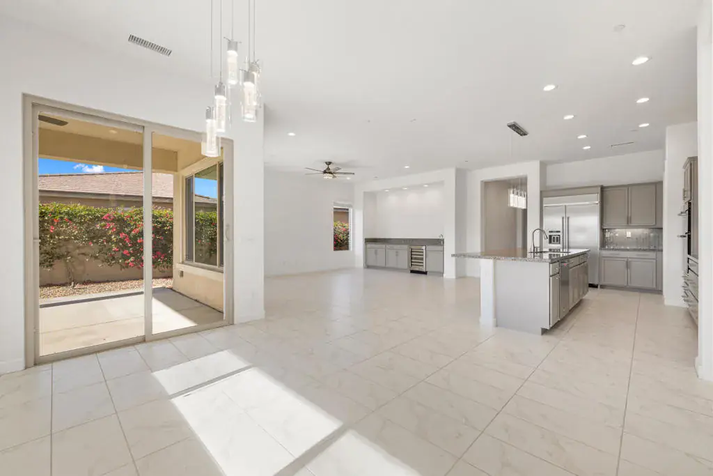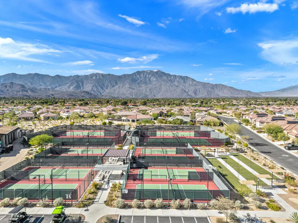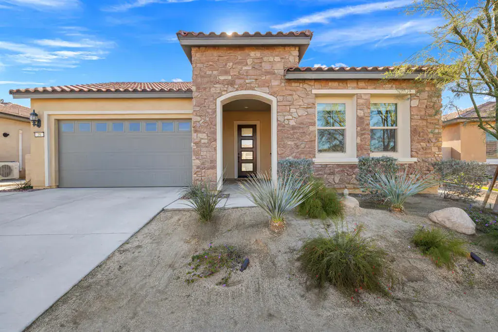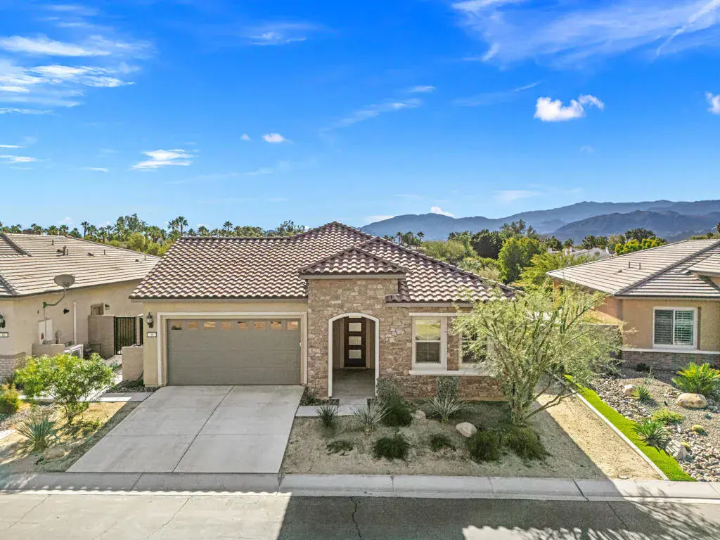 Welcome to Del Webb Rancho Mirage — a premier 55+ community where resort-style living meets timeless desert elegance.This beautifully maintained 3-bedroom, 2-bath home showcases one of the community’s most sought-after floor plans. All bedrooms are generously sized, with the third offering flexible use as a guest room, office, or den.Inside, sophisticated upgrades abound — custom window treatments, designer ceiling fans, and elegant tile flooring create a refined ambiance throughout. The open-concept great room centers around a chef’s kitchen featuring upgraded Whirlpool appliances (including dual ovens), soft-close cabinetry, quartz countertops with full backsplash, pendant-lit island seating, and a walk-in pantry.Dual upgraded sliding doors lead to an extended covered patio and expanded hardscape, ideal for entertaining or quiet evenings enjoying mountain views, the palm trees of the adjoining Westin Resort during the day, and twinkling lights at night.The primary suite is a private retreat, offering a spacious layout, dual quartz-topped vanities, premium cabinetry, upgraded lighting, a large walk-in shower with quartz surround, and a generous walk-in closet. Guest bedrooms and the flex space are thoughtfully separated for optimal privacy.Additional highlights include leased solar (approx. $113/month), an expanded laundry room with utility sink and cabinetry, and an oversized 2-car garage with extra space for a golf cart or additional storage. Residents of Del Webb Rancho Mirage enjoy a vibrant, active lifestyle with access to world-class amenities — a state-of-the-art clubhouse, resort pool and spa, fitness center, pickleball, tennis, bocce ball, and more.Experience the perfect blend of luxury, comfort, and community living — all within one of the desert’s most desirable 55+ destinations.