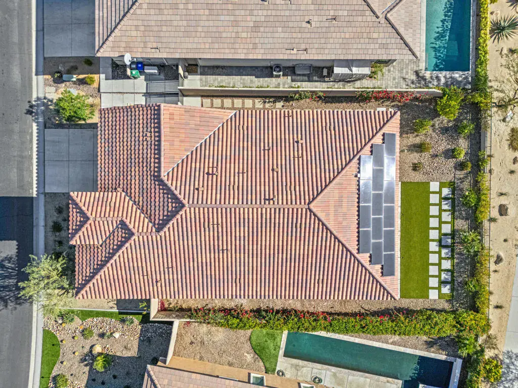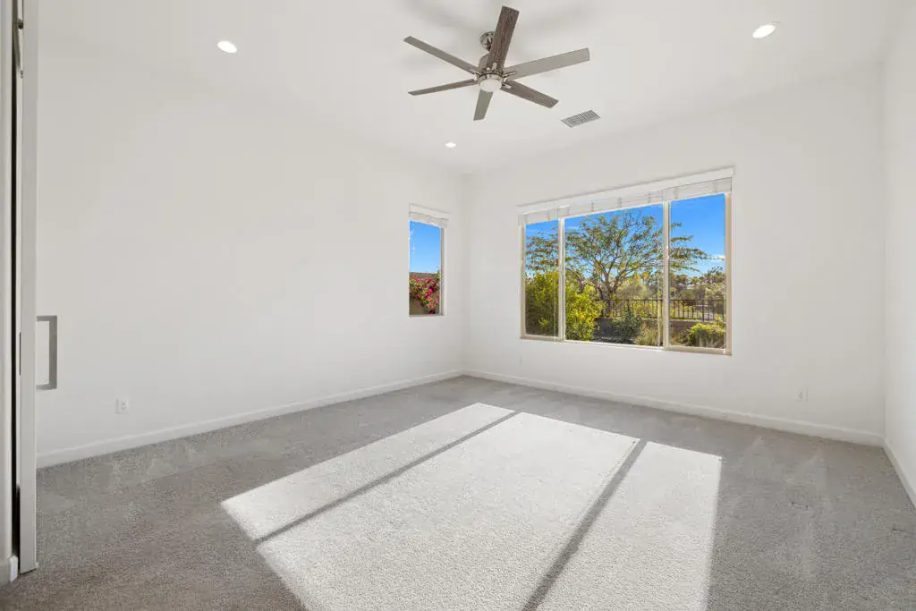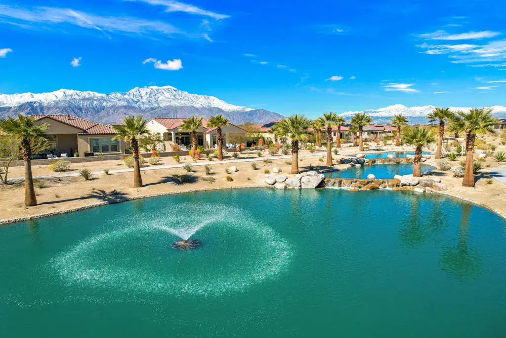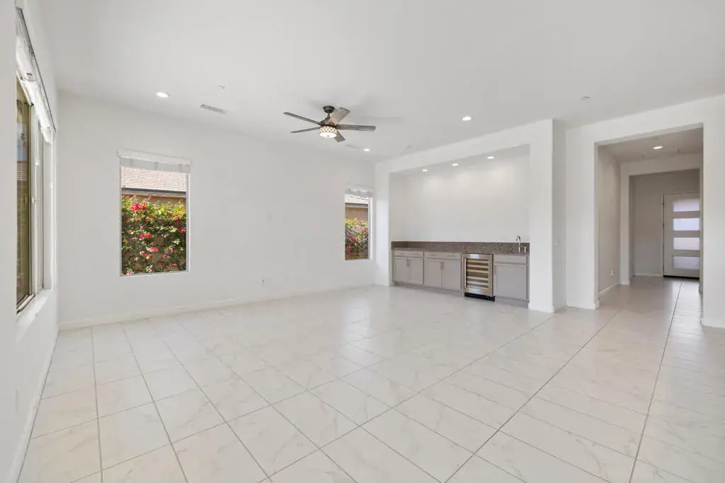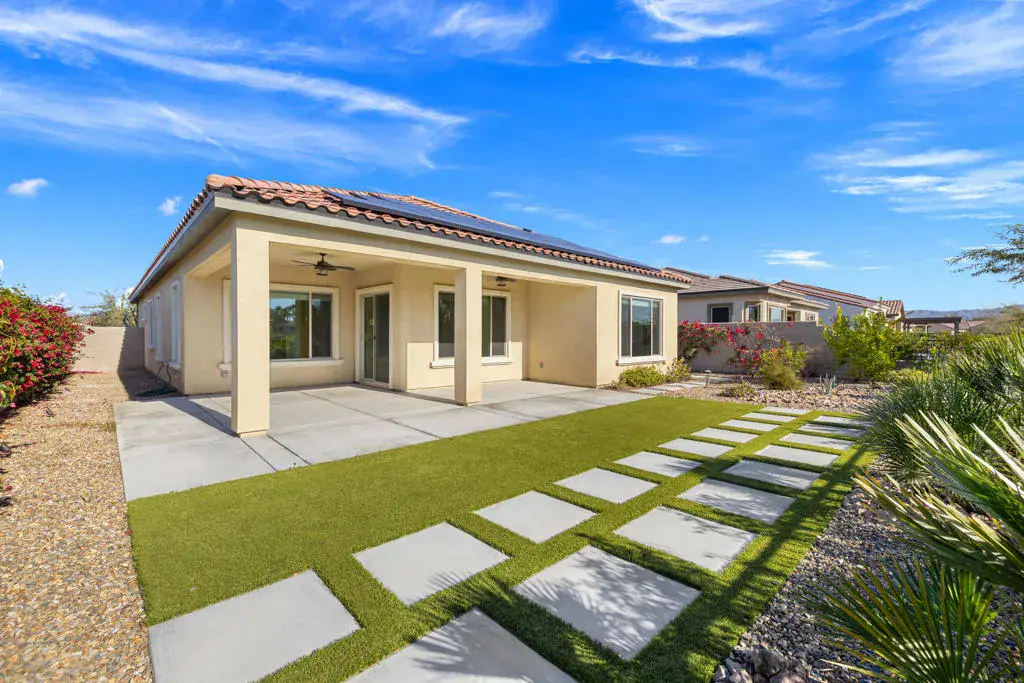 Welcome to Del Webb Rancho Mirage — a premier 55+ community where resort-style living meets timeless desert elegance.This beautifully maintained 3-bedroom, 2-bath home showcases one of the community’s most sought-after floor plans. All bedrooms are generously sized, with the third offering flexible use as a guest room, office, or den.Inside, sophisticated upgrades abound — custom window treatments, designer ceiling fans, and elegant tile flooring create a refined ambiance throughout. The open-concept great room centers around a chef’s kitchen featuring upgraded Whirlpool appliances (including dual ovens), soft-close cabinetry, quartz countertops with full backsplash, pendant-lit island seating, and a walk-in pantry.Dual upgraded sliding doors lead to an extended covered patio and expanded hardscape, ideal for entertaining or quiet evenings enjoying mountain views, the palm trees of the adjoining Westin Resort during the day, and twinkling lights at night.The primary suite is a private retreat, offering a spacious layout, dual quartz-topped vanities, premium cabinetry, upgraded lighting, a large walk-in shower with quartz surround, and a generous walk-in closet. Guest bedrooms and the flex space are thoughtfully separated for optimal privacy.Additional highlights include leased solar (approx. $113/month), an expanded laundry room with utility sink and cabinetry, and an oversized 2-car garage with extra space for a golf cart or additional storage. Residents of Del Webb Rancho Mirage enjoy a vibrant, active lifestyle with access to world-class amenities — a state-of-the-art clubhouse, resort pool and spa, fitness center, pickleball, tennis, bocce ball, and more.Experience the perfect blend of luxury, comfort, and community living — all within one of the desert’s most desirable 55+ destinations.