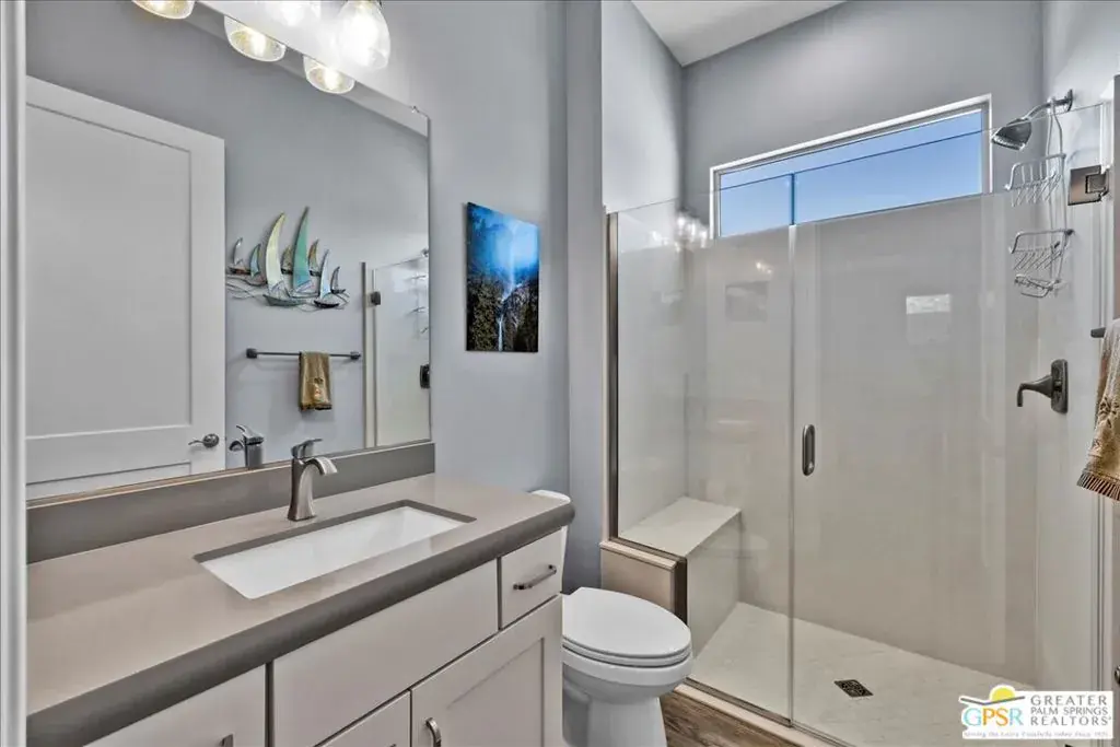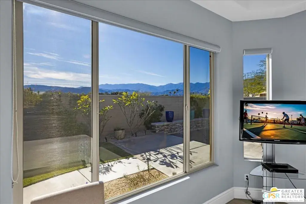 Highly desirable Phase 2, Plan 5 Haven floorplan with a charming Spanish facade and coveted SIDE COURTYARD, perfectly positioned to capture sweeping PANORAMIC MOUNTAIN VIEWS with OWNED SOLAR. This beautifully upgraded 2-bedroom, 2-bath home with den/flex space offers an exceptional blend of style, comfort, and indoor-outdoor living. From the moment you enter, you’ll appreciate the thoughtful upgrades throughout, including 7-inch baseboards, an interior archway package, and brushed nickel hardware and fixtures. The heart of the home is the stunning kitchen, featuring upgraded cabinetry with DOVETAIL JOINERY AND SOFT-CLOSE DRAWERS, 42-inch upper cabinets with crown molding, an EXECUTIVE ISLAND WITH ADDITIONAL STORAGE, quartz countertops with a TRIPLE-EDGE DETAIL, glass tile backsplash, pendant lighting, and stainless steel appliances with convection microwave and oven. The open great room is filled with natural light and showcases EXPANSIVE MOUNTAIN VIEWS, enhanced by upgraded dual center sliding glass doors that open seamlessly to the covered patio. The primary suite has been EXPANDED WITH THE BAY WINDOW OPTION, adding square footage and additional windows to fully enjoy the views, along with a TRAY CEILING UPGRADE for added height and elegance. The spa-inspired ensuite bath offers dual vanities with upgraded quartz countertops, designer wall sconces, brushed nickel fixtures, a CUSTOM ZERO-THRESHOLD WALK-IN SHOWER with bench seating and grab bar, and a spacious walk-in closet. Step outside to your private backyard retreat, where a CUSTOM SALTWATER SPOOL WITH TANNING SHELF AND ARTIFICIAL CURRENT SYSTEM is framed by tasteful hardscape and softscape, all set against dramatic mountain backdrops. The side courtyard off the kitchen provides yet another outdoor space – ideal for dining, entertaining, or relaxing under the desert sky. The secondary bedroom, located at the front of the home, offers privacy for guests and convenient access to the secondary bath with an upgraded glass-enclosed shower. The versatile den/flex space is outfitted with a CUSTOM BUILT-IN DESK and wall cabinetry, tray ceiling, and a large window with views of the courtyard and mountains – perfect for a home office or creative space. Additional highlights include an EXPANDED LAUNDRY ROOM with generous counter and cabinet storage, an OVERSIZED TWO-CAR GARAGE with room for storage, workshop space, or larger vehicles. Located within the prestigious 55+ Del Webb Rancho Mirage community, residents enjoy access to a state-of-the-art CLUBHOUSE with pool, spa, fitness center, tennis, PICKLEBALL, and a full calendar of social activities. HOA DUES NOW INCLUDE A PREMIUM CABLE AND INTERNET PACKAGE, adding even more value to this exceptional home.