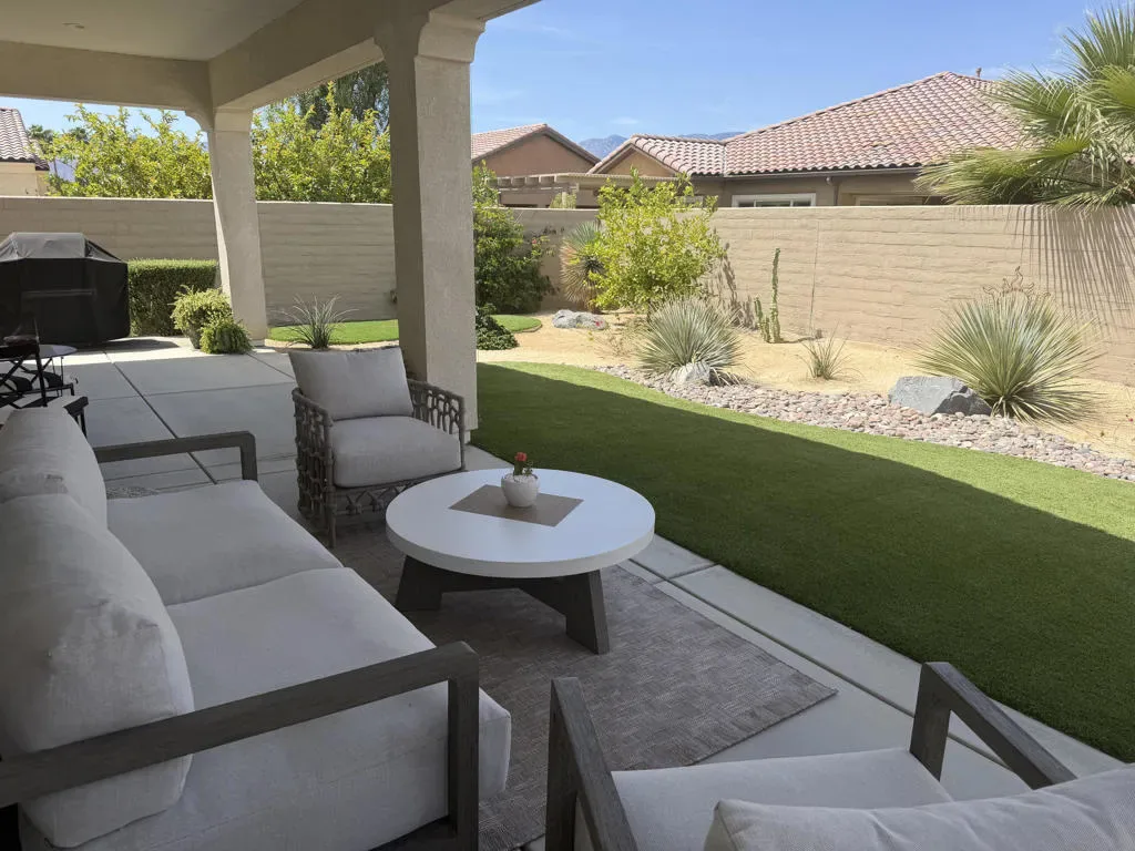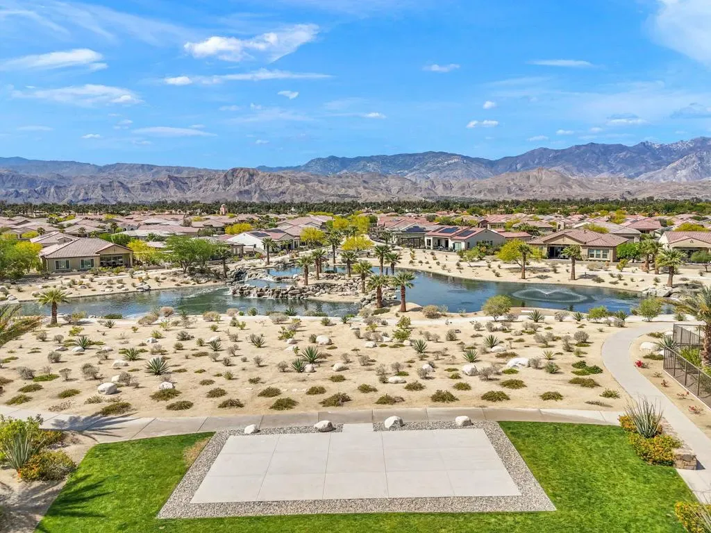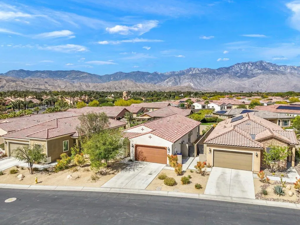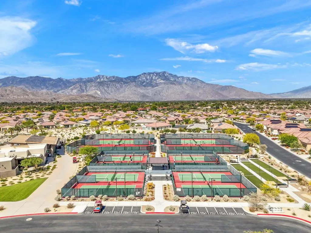 This highly sought-after Phase 1, Plan 2 Solitude residence is perfectly positioned on a generous, pool-sized lot showcasing west-facing mountain views and unforgettable desert sunsets. Thoughtfully upgraded with over $65,000 in builder enhancements, this home blends style, comfort, and indoor-outdoor living. Features include beautiful engineered wood flooring, Dove Grey cabinetry, quartz countertops, recessed lighting, and a dramatic center-opening sliding glass door that creates a seamless wall of glass–effortlessly extending your living space to the outdoors. Enjoy a full-length patio complete with remote-controlled exterior shades, ideal for relaxing or entertaining year-round. Inside, premium remote window shades enhance both the living room and primary bedroom. The spacious primary suite offers dual vanities, a walk-in shower, and abundant closet and linen storage. Energy efficiency is top of mind with a 12-panel OWNED SOLAR system–helping you say goodbye to high electricity bills. Located just a short stroll from the community’s exceptional amenities, residents enjoy a clubhouse, fitness center, tennis and pickleball courts, putting green, and a stunning saltwater pool and spa maintained at 82 degrees year-round–all set against sweeping mountain views. Additional highlights include a scenic 3-mile nature path and 24/7 security for peace of mind. Furnishings available outside of escrow. Experience the best of desert living in this beautifully upgraded, move-in ready home!