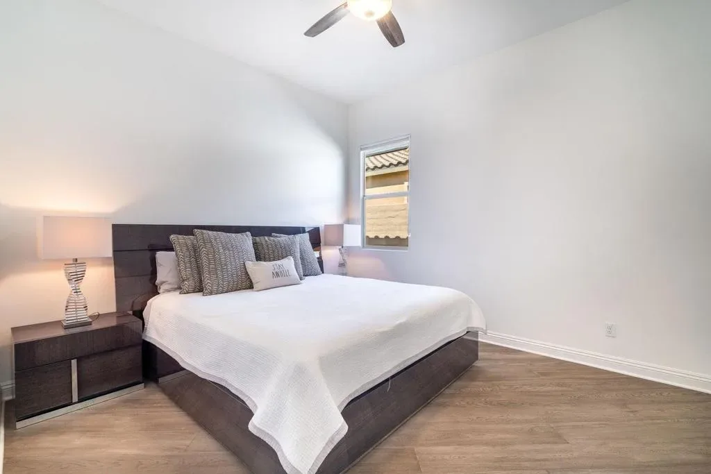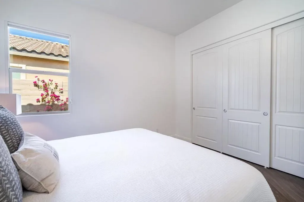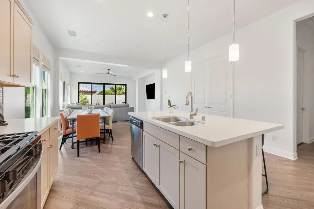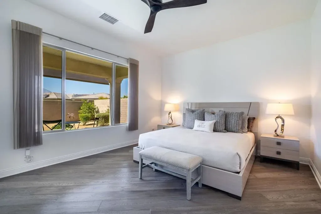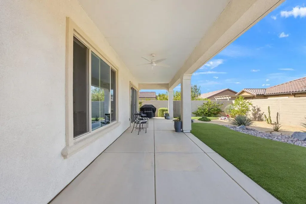 This highly sought-after Phase 1, Plan 2 Solitude residence is perfectly positioned on a generous, pool-sized lot showcasing west-facing mountain views and unforgettable desert sunsets. Thoughtfully upgraded with over $65,000 in builder enhancements, this home blends style, comfort, and indoor-outdoor living. Features include beautiful engineered wood flooring, Dove Grey cabinetry, quartz countertops, recessed lighting, and a dramatic center-opening sliding glass door that creates a seamless wall of glass–effortlessly extending your living space to the outdoors. Enjoy a full-length patio complete with remote-controlled exterior shades, ideal for relaxing or entertaining year-round. Inside, premium remote window shades enhance both the living room and primary bedroom. The spacious primary suite offers dual vanities, a walk-in shower, and abundant closet and linen storage. Energy efficiency is top of mind with a 12-panel OWNED SOLAR system–helping you say goodbye to high electricity bills. Located just a short stroll from the community’s exceptional amenities, residents enjoy a clubhouse, fitness center, tennis and pickleball courts, putting green, and a stunning saltwater pool and spa maintained at 82 degrees year-round–all set against sweeping mountain views. Additional highlights include a scenic 3-mile nature path and 24/7 security for peace of mind. Furnishings available outside of escrow. Experience the best of desert living in this beautifully upgraded, move-in ready home!