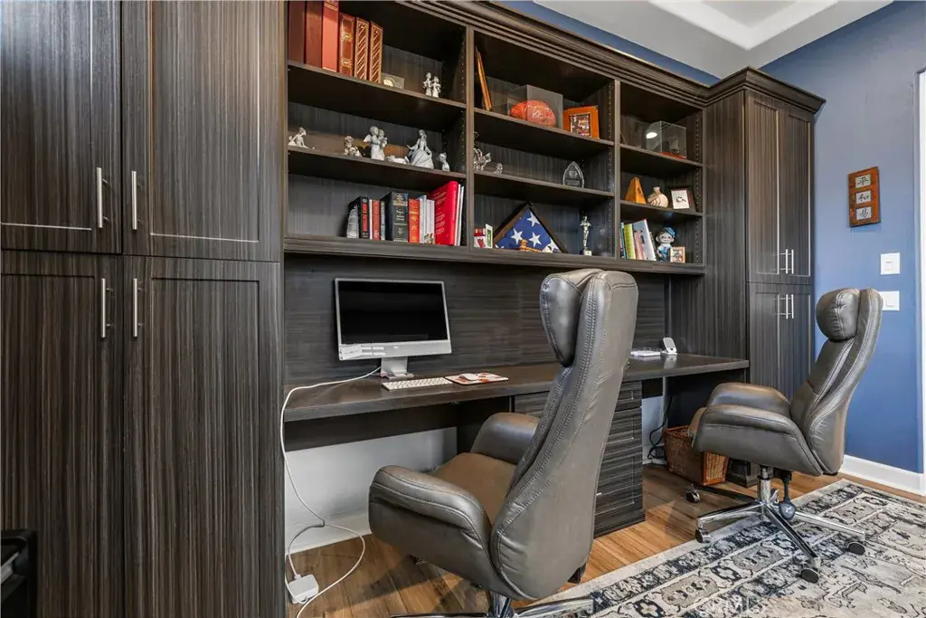 The open-concept family room is a true showpiece, featuring a custom white stone fireplace, recessed- lighted display niches, and an integrated surround sound system that creates an immersive entertainment experience. The kitchen and laundry room are enhanced by designer tile backsplashes, while thoughtfully crafted custom cabinetry includes built-in drawers in the front bedroom and custom shelving, cabinetry, and a built-in desk in the den, ideal for a refined home office or creative retreat.