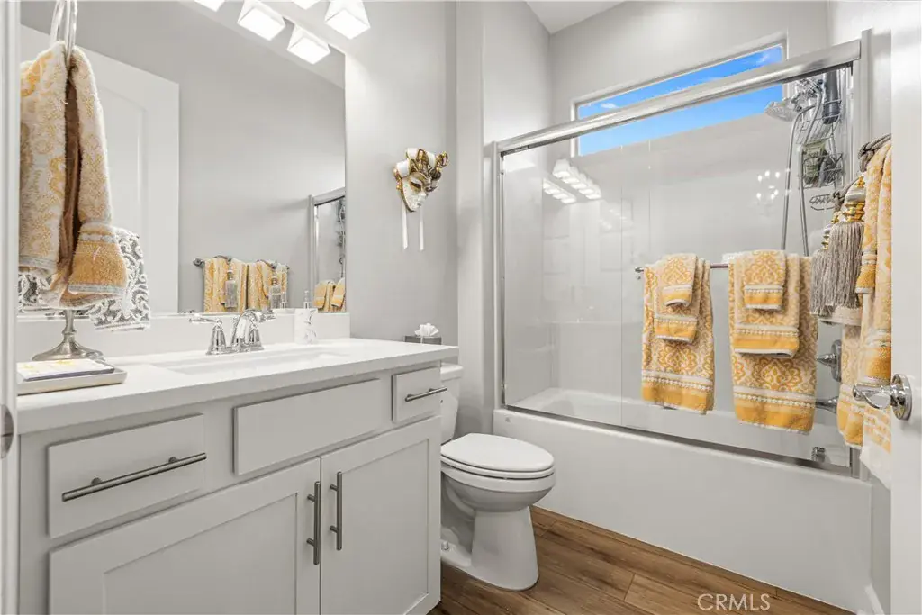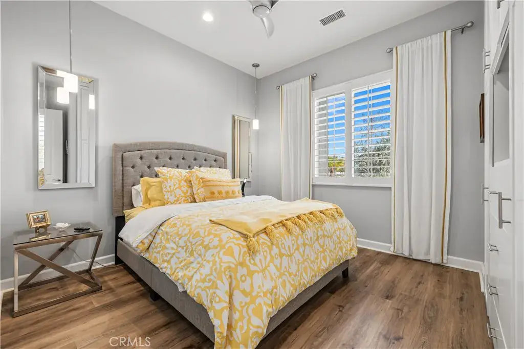 The expansive primary suite offers a private sanctuary, highlighted by a beautifully appointed spa-inspired bathroom and large walk-in closet with fully customized built-in shelving and cabinetry designed for both elegance and organization. Blackout shades provide comfort for those hot days and privacy, completing the serene retreat.