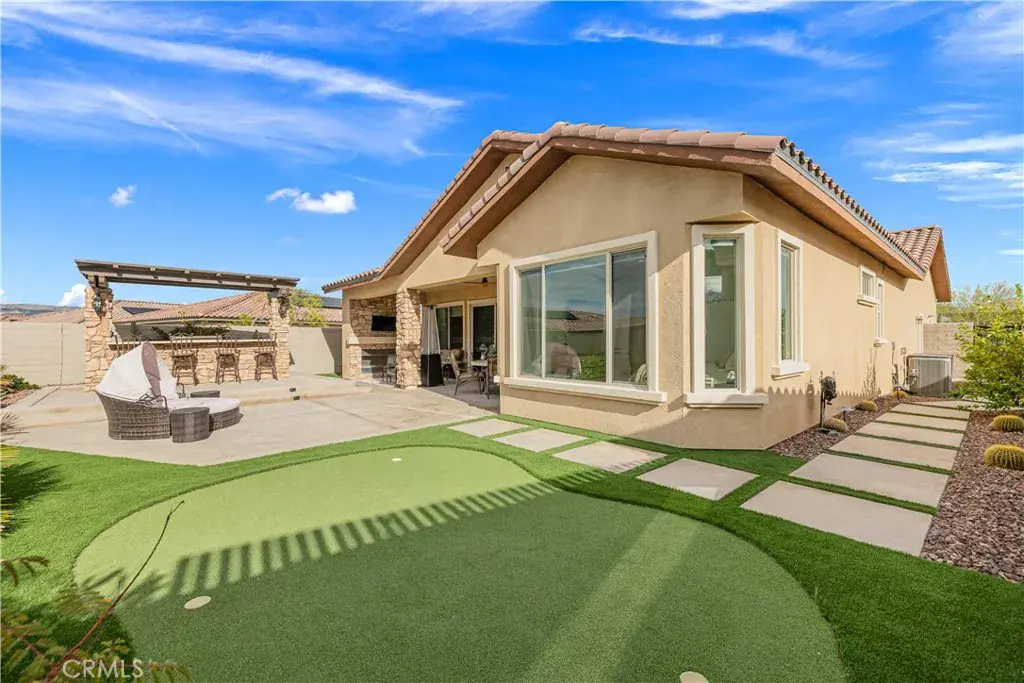 Step outside to a resort-style outdoor oasis crafted for both relaxation and entertaining. The enclosed patio with porcelain tile flooring flows seamlessly to a custom outdoor kitchen with stone finishes, built-in grill, countertop, and pergola. A custom concrete patio with illuminated steps, a 3-hole putting green, and artificial turf in both the front and back yards create a low-maintenance yet luxurious environment. An outdoor stone entertainment wall, designed to match the grill area, completes this exceptional space.