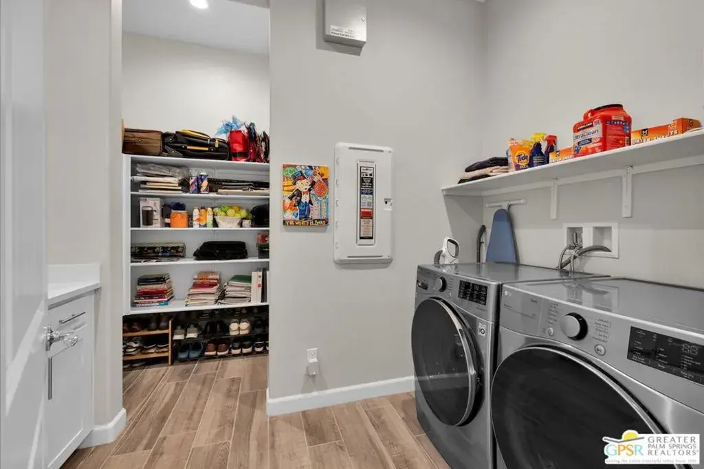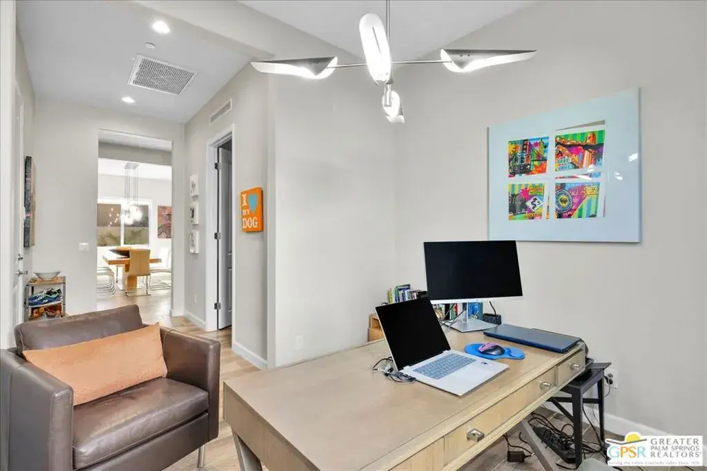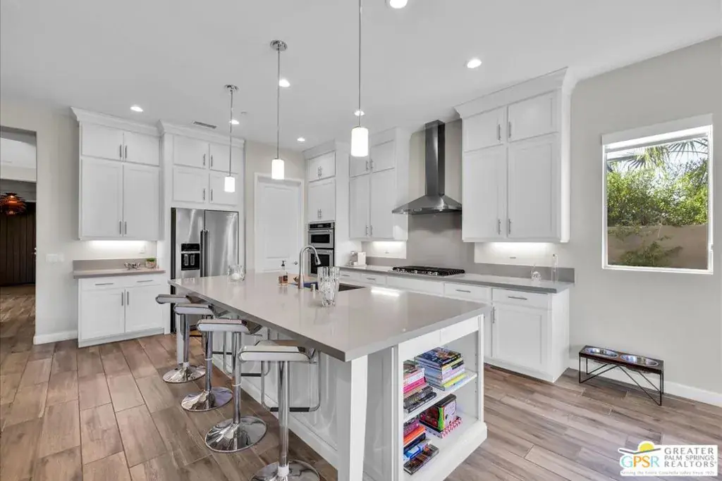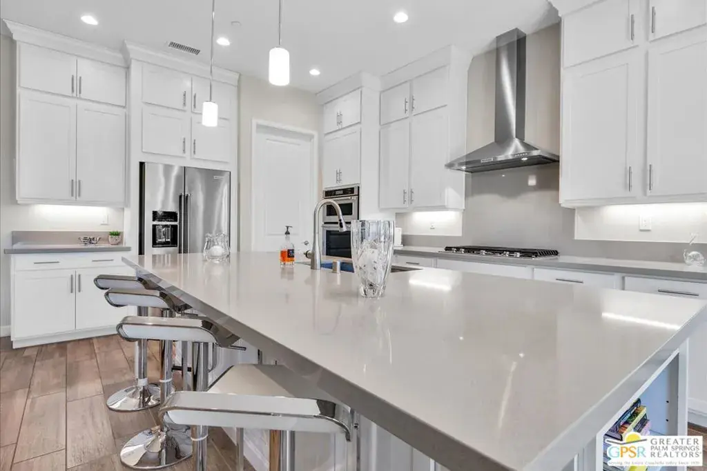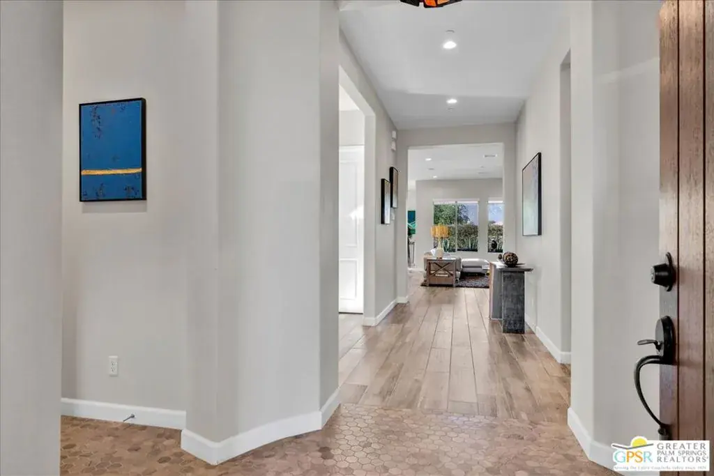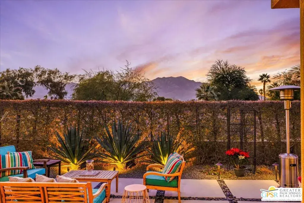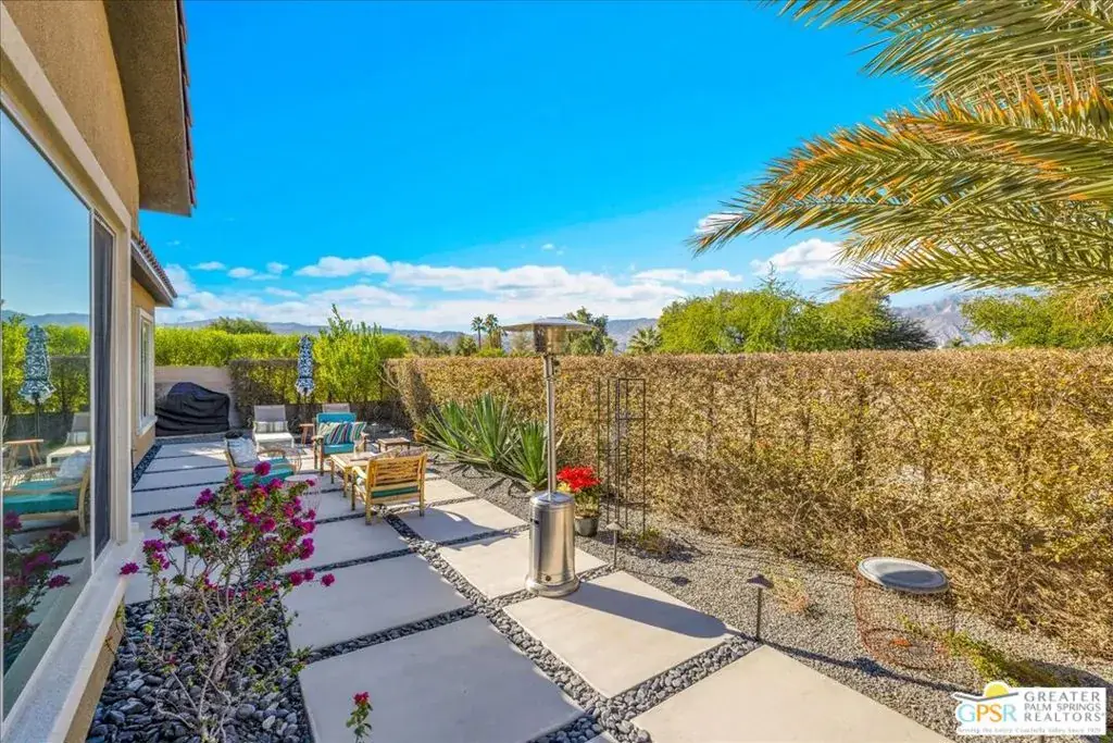 Tucked away on a quiet CUL-DE-SAC, this exceptional Plan 7 Refuge with Tuscan facade showcases breathtaking MOUNTAIN VIEWS and an ideal DUAL-SUITE LAYOUT. LEASED SOLAR (Approx. $112/mo). The primary suite is privately positioned at the rear of the home to fully capture the dramatic scenery, while a spacious secondary suite at the front offers comfort and privacy for guests. Inside, porcelain tile plank flooring flows throughout, setting a sophisticated tone. The beautifully appointed kitchen is a true centerpiece, featuring FLOOR-TO-CEILING CABINETRY with 42″ uppers, jewel cabinets, and crown molding, along with an EXECUTIVE ISLAND offering additional storage and power outlets. High-end KitchenAid professional appliances – including convection oven and microwave – are paired with quartz countertops and modern brushed nickel hardware for a sleek, contemporary finish. The kitchen opens seamlessly to the expansive dining and living areas, creating an inviting space filled with natural light and ideal for entertaining. The primary suite is enhanced by the BAY WINDOW OPTION, adding both square footage and an abundance of natural light while perfectly framing the stunning MOUNTAIN VIEWS. The spa-inspired ensuite bath offers a generous GLASS-ENCLOSED SHOWER with rainfall showerhead, dual quartz-topped vanities, a HEATED TOWEL RACK, and a large walk-in closet. A convenient POWDER ROOM off the living area adds functionality for guests. This thoughtfully expanded home also includes TWO VERSATILE FLEX SPACES – one with a walk-in closet that can easily be converted into a third bedroom, and another currently used as a home office. Additional upgrades include UPGRADED LIGHTING, ceiling fans, an EXPANDED LAUNDRY ROOM with folding counter and EXTRA STORAGE, a WHOLE-HOUSE WATER FILTRATION SYSTEM, insulated garage door, overhead garage storage, and a 220-VOLT EV OUTLET. Step outside to the fully landscaped backyard featuring low-maintenance desert plantings, modern hardscape design, and sweeping MOUNTAIN VIEWS – an ideal setting for relaxation or entertaining. Located in the prestigious 55+ Del Webb Rancho Mirage community, residents enjoy access to a state-of-the-art CLUBHOUSE with pool, spa, fitness center, PICKLEBALL AND TENNIS COURTS, and an active social calendar. HOA DUES NOW INCLUDE PREMIUM CABLE AND INTERNET. This remarkable home offers the perfect blend of luxury, flexibility, and iconic desert living and is an absolute must-see.