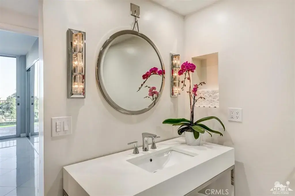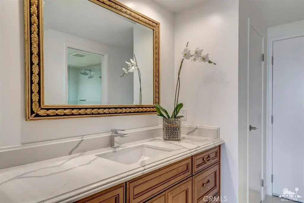 Desert Island Designer Penthouse. GATED and Guard & Elevator to 7th floor. This exceptional home has picturesque Mountain, Lake, and Golf course views. Located minutes from shopping on El Paseo Drive. Beautifully designed penthouse with customized upgrades i.e., Porcelain tile flooring, custom recessed lighting, custom fixtures, and bathrooms have Quartz counters. State-of-the-art appliances and fixtures throughout. Remote-controlled fireplace with Terra Cotta herringbone brick and limestone.