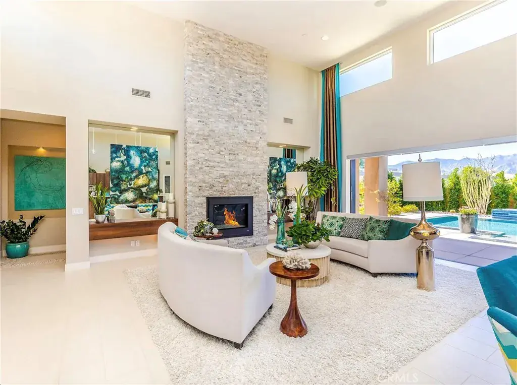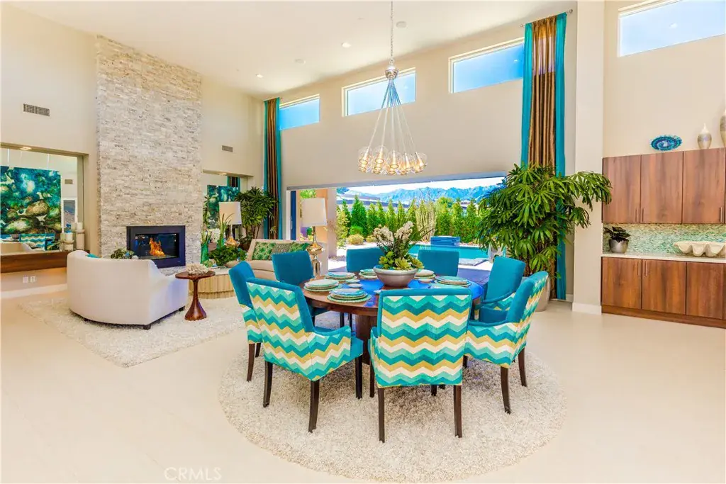 Upon entry, soaring 16-foot ceilings, dramatic chandeliers, and walls of natural light create an immediate sense of grandeur. The open-concept great room is ideal for relaxation and entertaining, anchored by a statement stone fireplace and complemented by a full entertainer’s wet bar with ice maker, wine refrigerator, and high-end Control4 surround sound throughout the home.