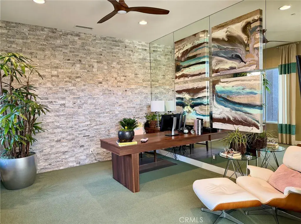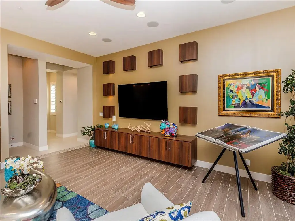 A dedicated media room offers a cinematic experience with a 70” television and wine refrigerator—ideal for movie nights or game days. Throughout the home, custom drapery, plantation shutters, and electric remote shades enhance both style and function. New carpet has recently been installed in the office, primary suite, and an additional bedroom.