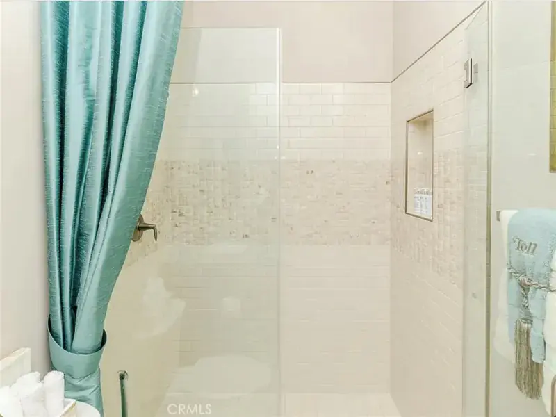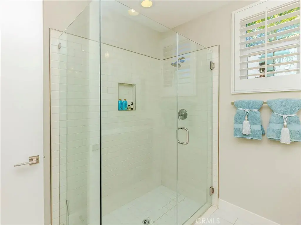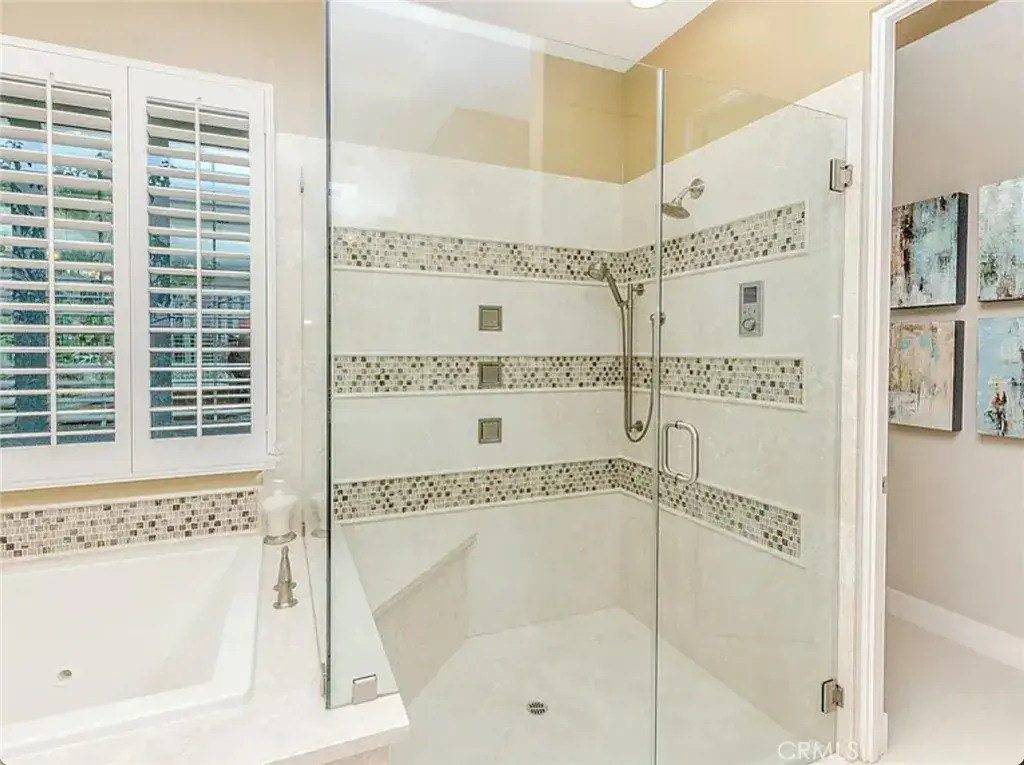 The primary suite is a serene sanctuary, highlighted by a designer textured accent wall, custom drapery, and a spa-inspired bath with dual marble vanities, custom cabinetry, an oversized jetted soaking tub, and a glass-enclosed shower with multiple individually controlled shower heads. The reimagined walk-in closet offers extensive custom shelving and thoughtful accessory storage.