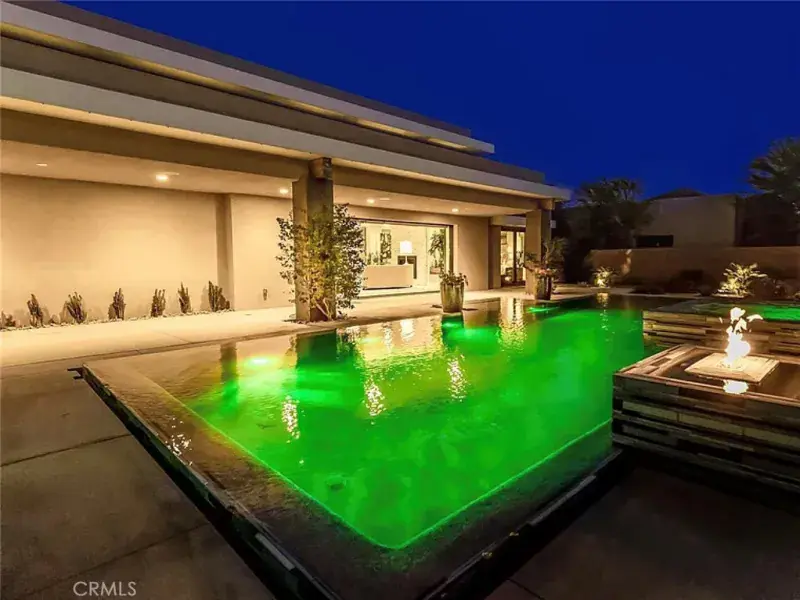 Oversized pocket doors provide seamless indoor-outdoor flow, opening from the kitchen to a private courtyard and from the great room to the resort-style backyard. Here, an infinity-edge Pebble Tec pool and spa are flanked by dual fire features, with smartphone-controlled pool functions and misters creating a private oasis for year-round enjoyment.