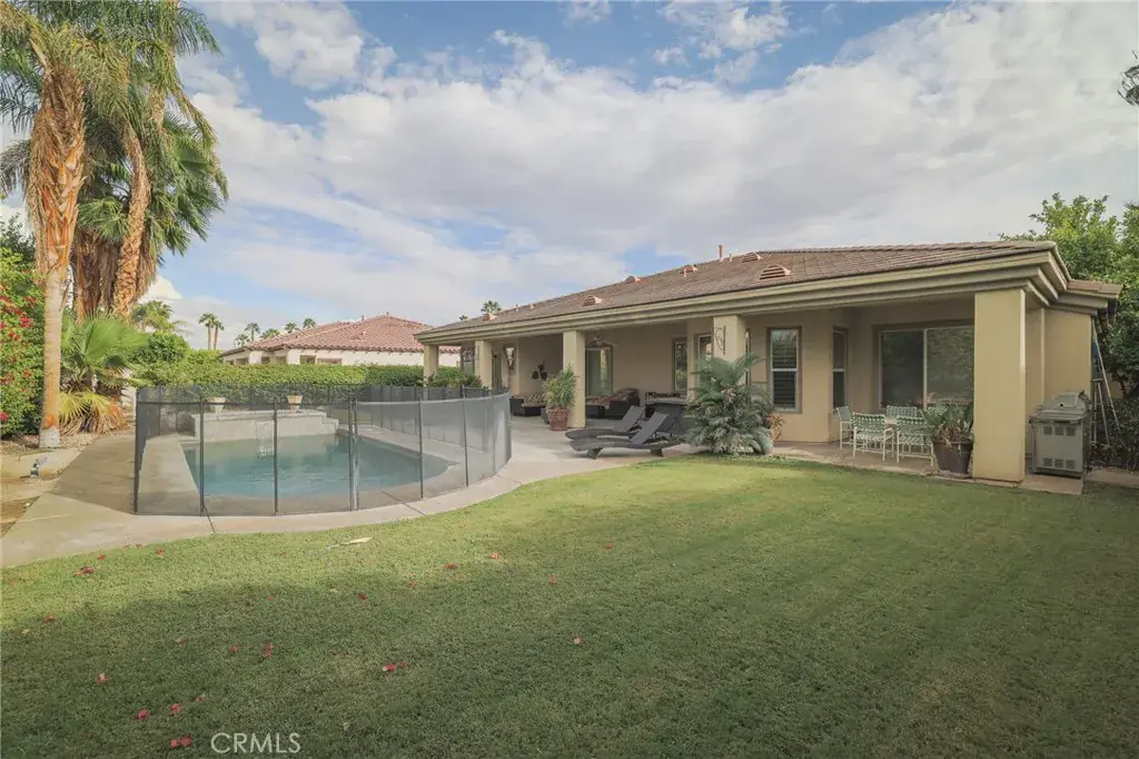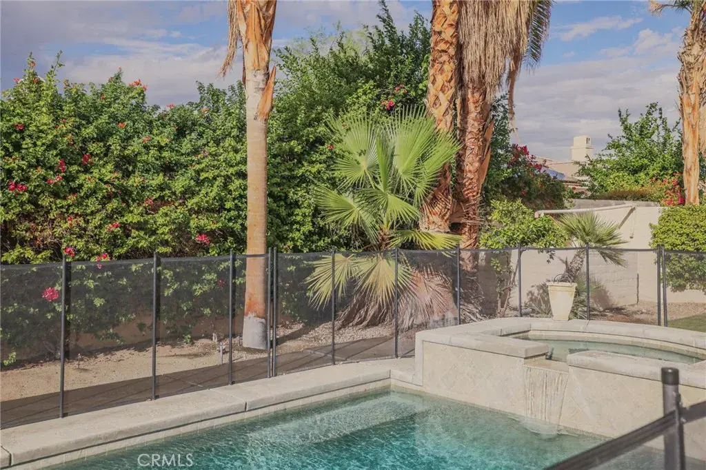 This spacious residence offers five bedrooms, including a primary suite and a secondary primary suite, plus three additional bedrooms (tax records reflect four bedrooms and 3.5 bathrooms; the owner considers the office a fifth bedroom). A gated courtyard entry welcomes you to your private oasis, where a sparkling pool provides the perfect retreat on warm Rancho Mirage summer days.