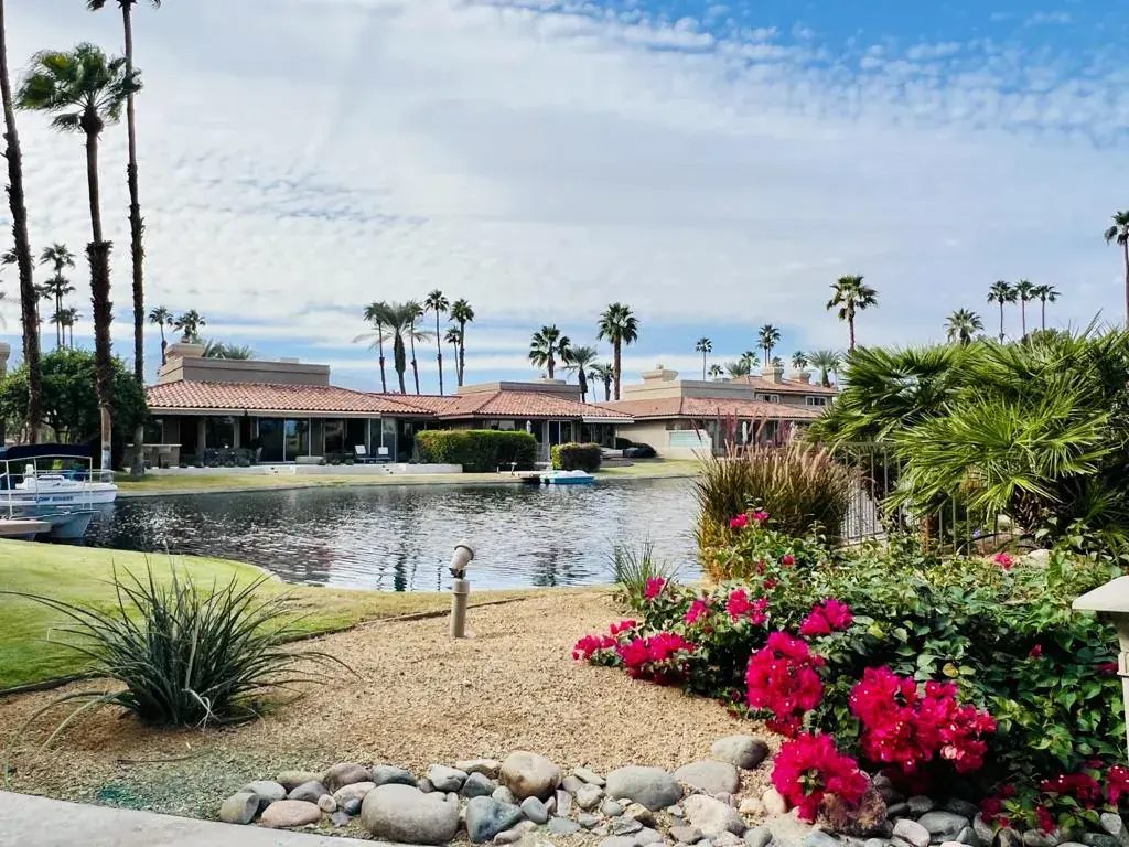 Nestled within the heart of Lake Mirage, this beautifully updated 3-bedroom, 3-bath residence combines comfort, elegance, and resort-style living. Step inside to a light-filled, open floor plan featuring tile and wood-look flooring throughout, classic wood shutters, and soaring cathedral ceilings. A double-sided fireplace warms both the living and dining areas, creating an inviting atmosphere for relaxing or entertaining. Expansive windows frame panoramic views of the lake and surrounding mountains, while the spacious patio invites you to enjoy tranquil mornings or sunset gatherings by the water. The primary suite offers peaceful lake views, a generous walk-in closet, and a luxurious ensuite bath complete with jetted tub and separate shower. Each bedroom features direct access to its own bathroom, ensuring privacy and convenience for all. This highly desired floor plan offers the ease of single-level living–no interior steps–and includes an assigned dock, perfect for a small electric boat or kayak. Located within the prestigious Lake Mirage Racquet Club, residents enjoy world-class amenities including 25 acres of open lake for sailing and rowing, scenic jogging and cycling paths, 10 tennis courts, 2 pickleball courts, 11 pools and spas, a fitness center, and a clubhouse ideal for private gatherings. All set within a guard-gated community just minutes from premier shopping, fine dining, and top-rated healthcare in the heart of Rancho Mirage.