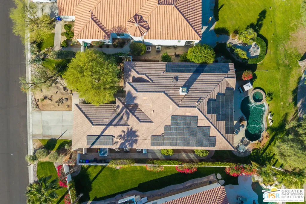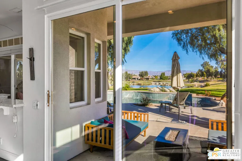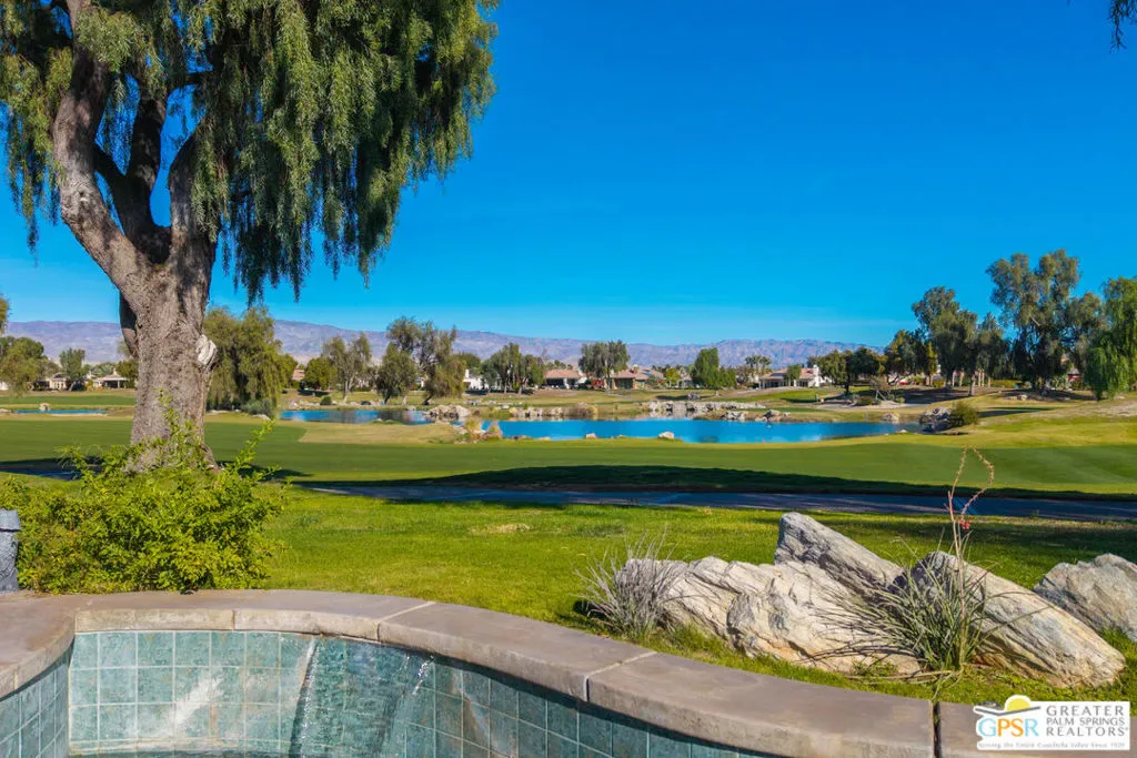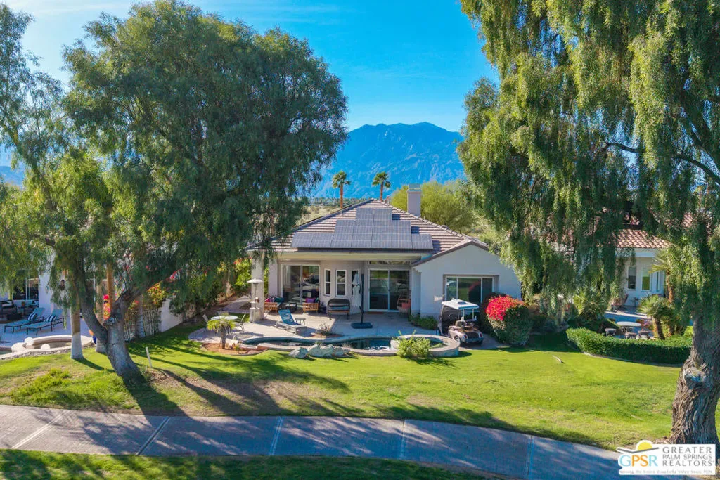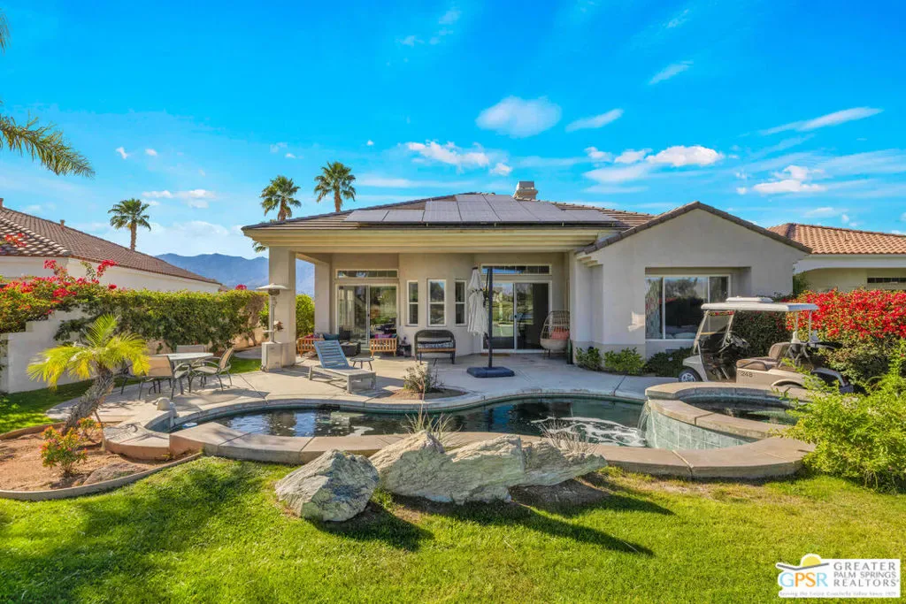 A true backyard oasis situated directly on the golf course, with expansive fairway and mountain views. Enjoy relaxed desert living with a private pool and spa, creating the perfect outdoor retreat. Inside, high ceilings enhance the open floor plan, offering a light and airy feel throughout. The dining area flows seamlessly into a chef’s kitchen featuring granite countertops, black stainless steel appliances, a center island, breakfast bar, dinning area, and ample cabinetry. Additional features include a water softener system, instant hot water throughout, newer dual-zone HVAC units, and a leased 48-panel solar system (Power Purchase Agreement) that produces power well beyond the current homeowner’s usage. The primary suite offers direct patio access and a spa-like bath with walk-in glass-enclosed shower, soaking tub, dual vanities, and two walk-in closets. Guest bedrooms are thoughtfully separated from the primary suite. This home is part of a beautifully maintained, guard-gated community with additional roving security and low HOA dues. HOA benefits include cable TV, lighted tennis and pickleball courts, a community pool/spa, and concierge trash service. Whether full-time or seasonal, this home offers the best of desert living in the heart of Rancho Mirage.
